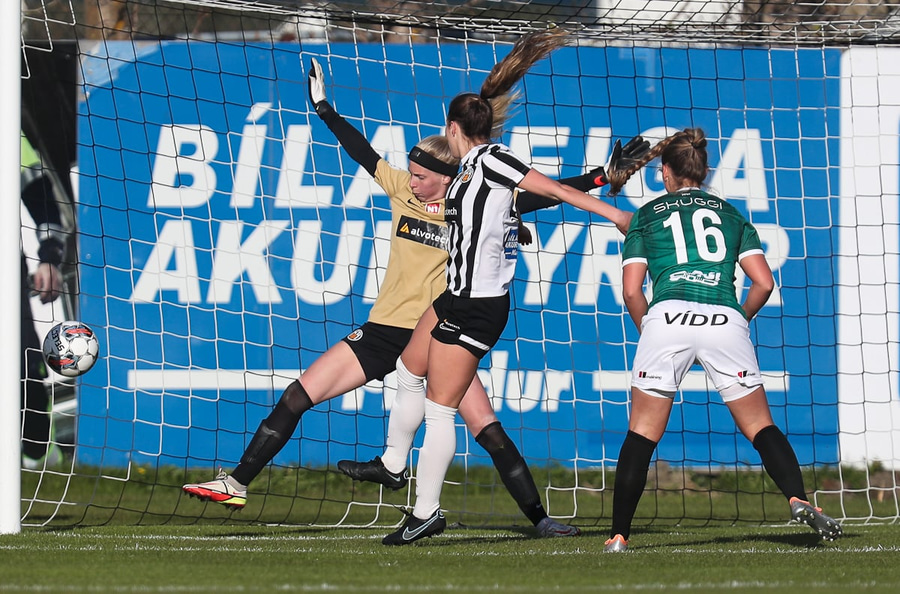 Hildur Antons vann boltann á frábæran hátt, lék upp að endamörkum og sendi stórhættulegan bolta þvert fyrir markið þar sem Birta var á auðum sjó en náði ekki til boltans.
