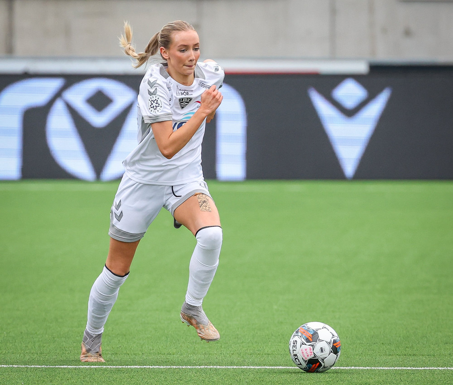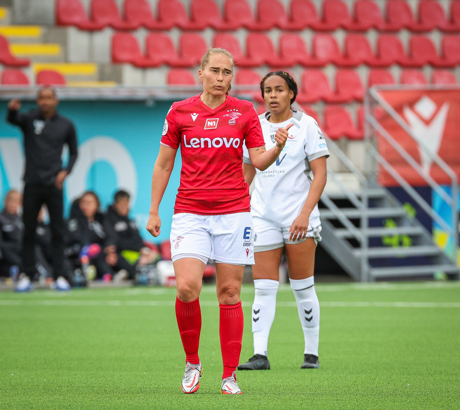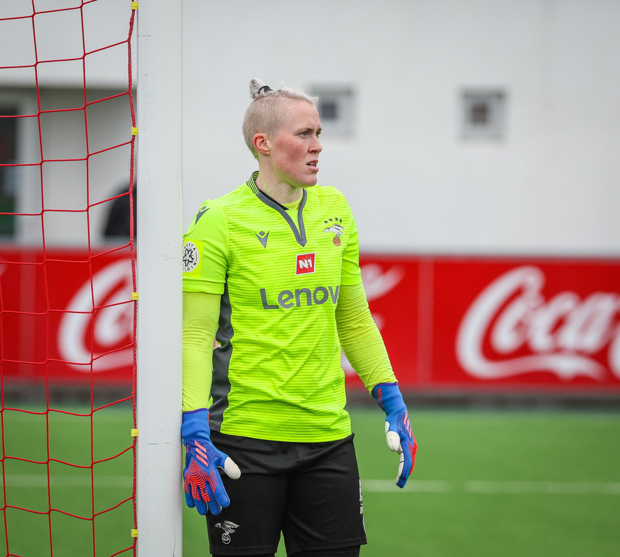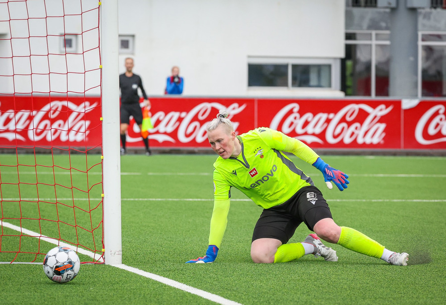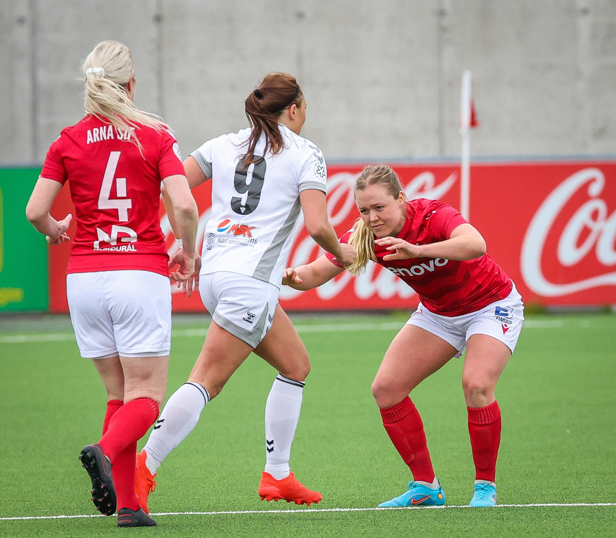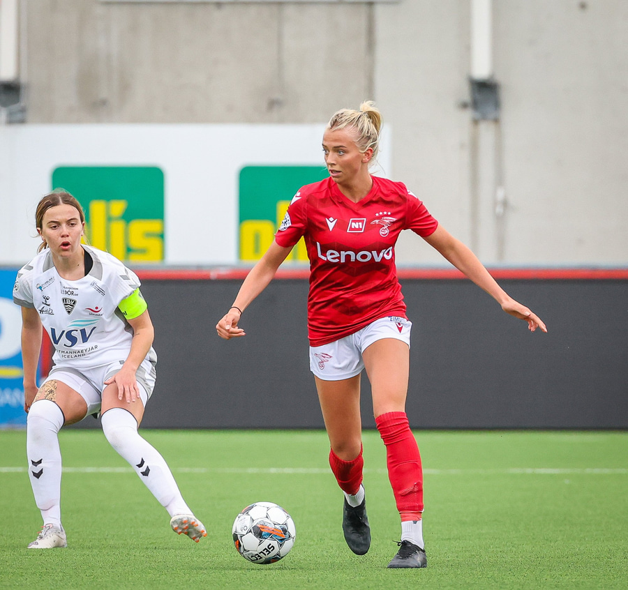 Brookelynn á hér fínasta skot fyrir utan teig en Guðný ver vel í marki gestanna.