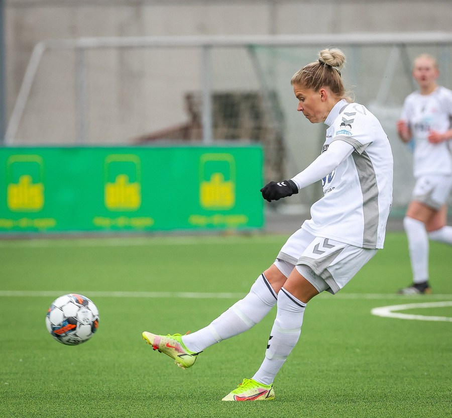 Elín Metta tekur skotið hægra megin í teignum en skotið fer framhjá.