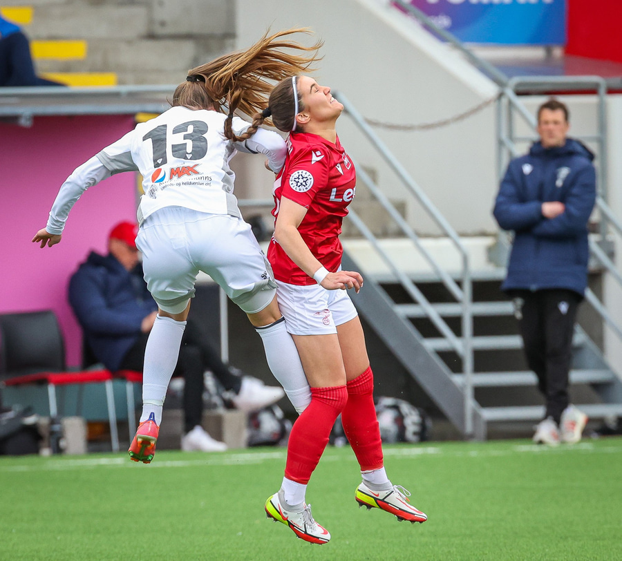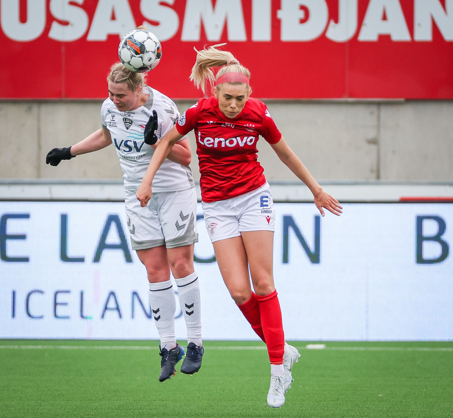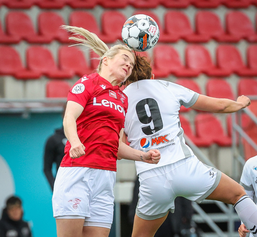 Ásdís tekur hornið og Ída nær kröftugum skalla sem nánast sleikir stöngina. Þarna mjóaði munu!