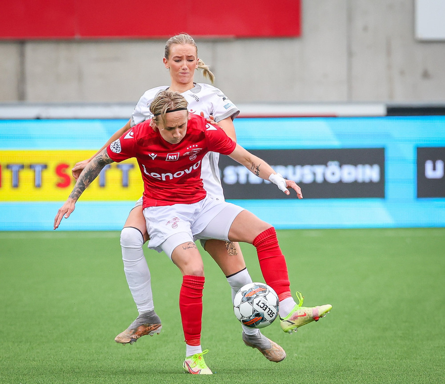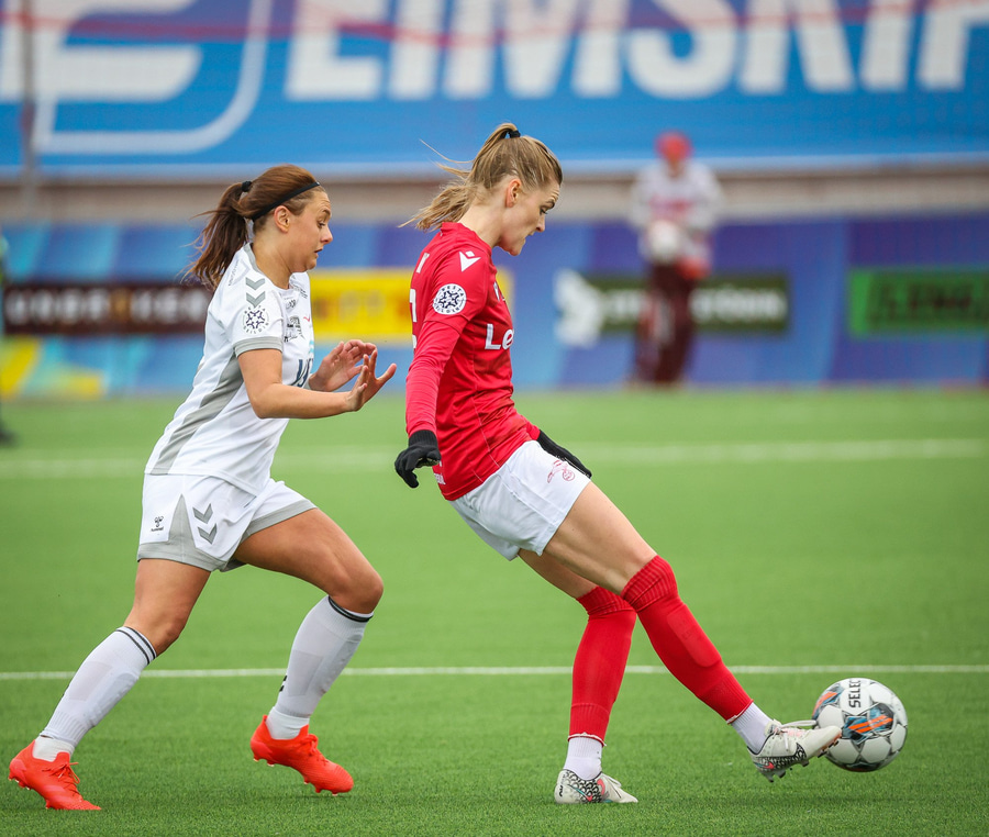 Olga kemst hér í gegn eftir hreinsun frá Júlíönu, tveir varnarmenn í Olgu en hún keyrir inn á hægri og á skot sem fer rétt svo yfir samskeytin. Olga gerði þetta frábærlega!