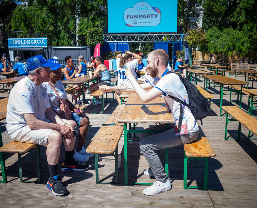 Eins og ég sagði áðan er tæplega þrjátíu gráðu hiti í Manchester og glampandi sól.