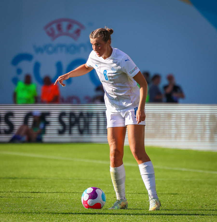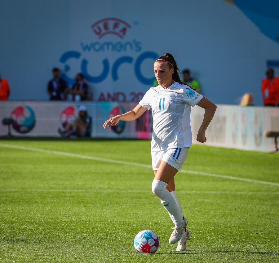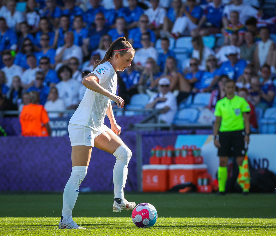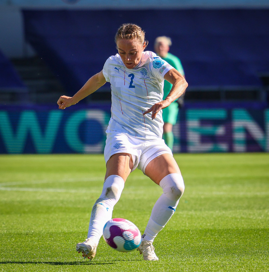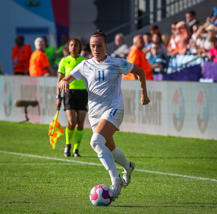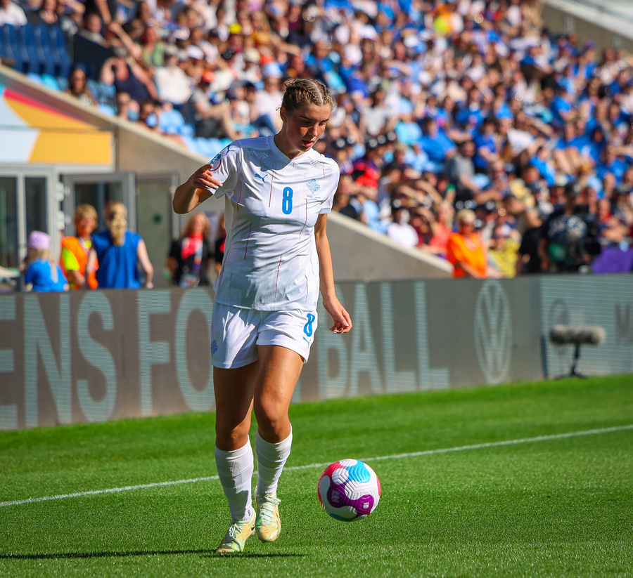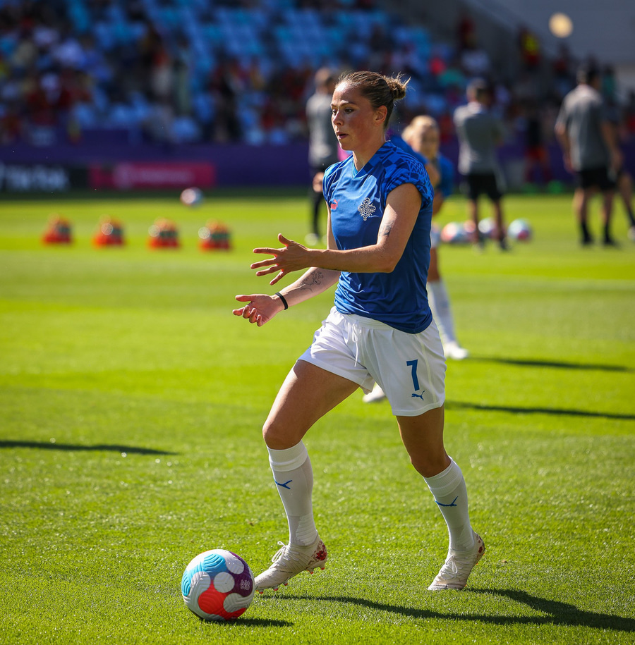 Berglind Björg tekur upphafsspyrnuna, Ísland byrjar með boltann!