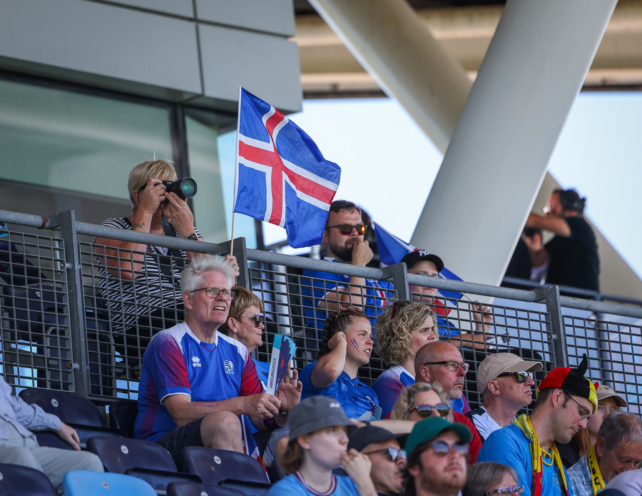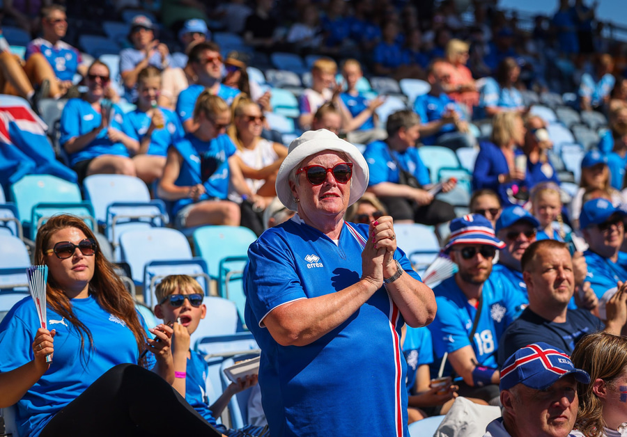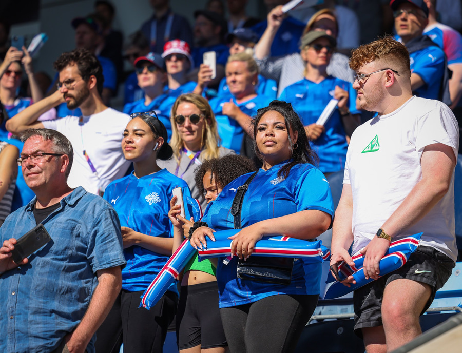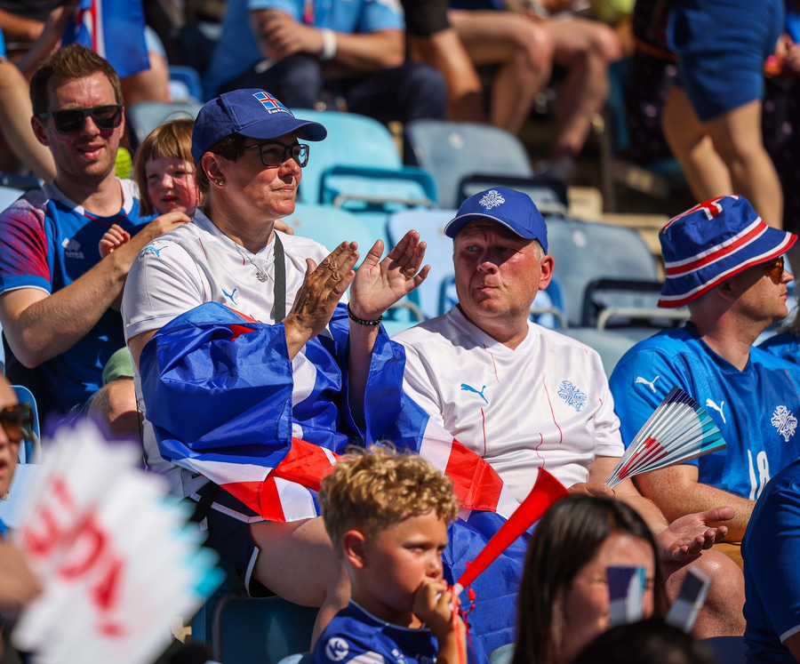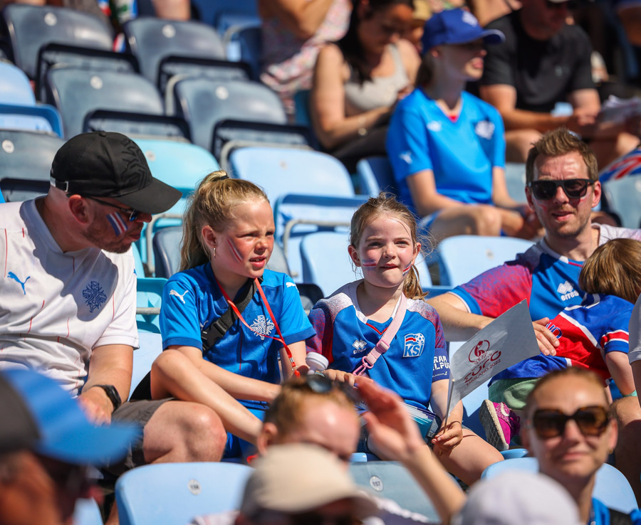 Stuðningsmenn Íslands eru byrjaðir að koma sér fyrir á vellinum og vallarþulurinn minnir fólk á að vera duglegt við að drekka vatn og bera á sig sólarvörn.