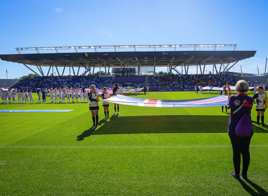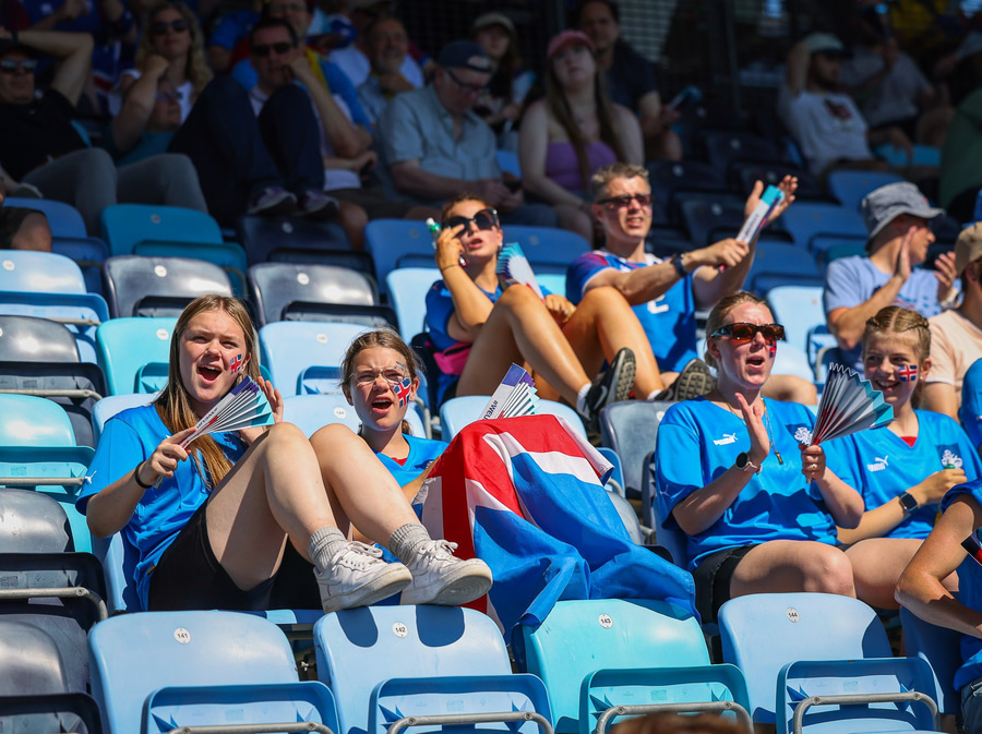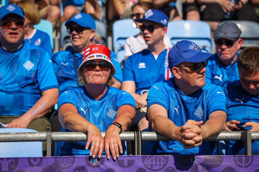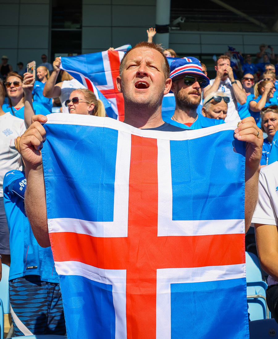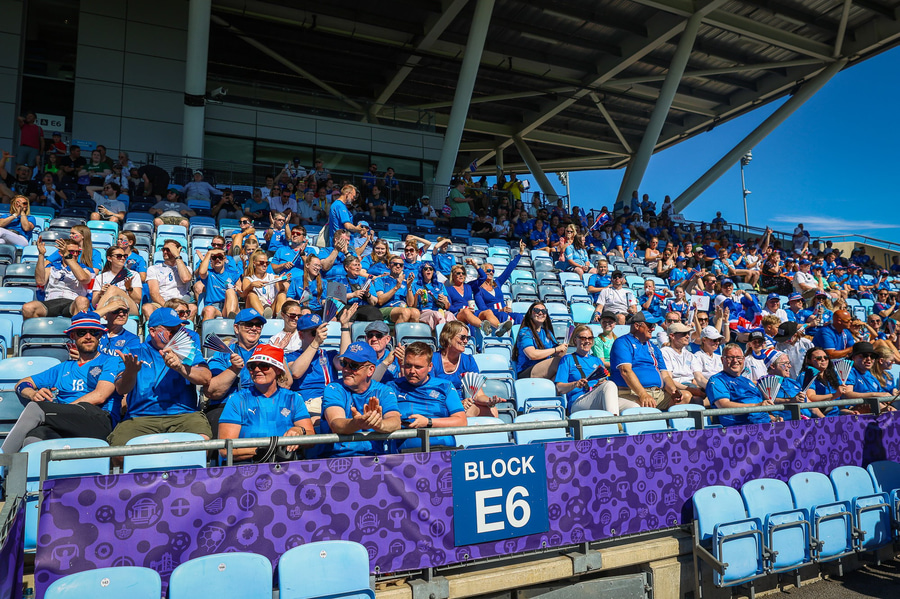 Stuðningsmenn Íslands eru byrjaðir að koma sér fyrir á vellinum og vallarþulurinn minnir fólk á að vera duglegt við að drekka vatn og bera á sig sólarvörn.