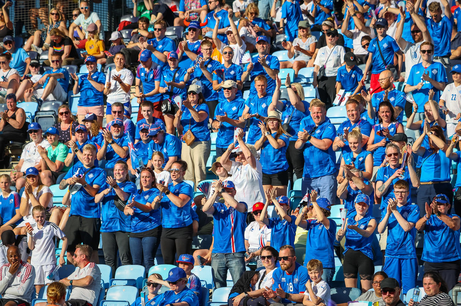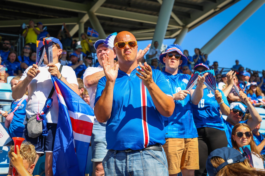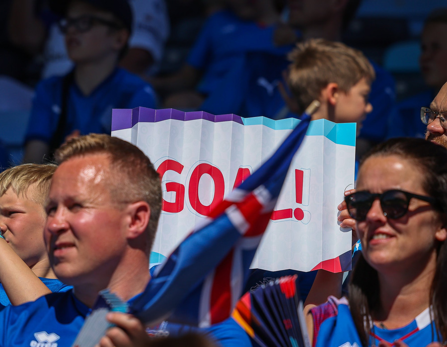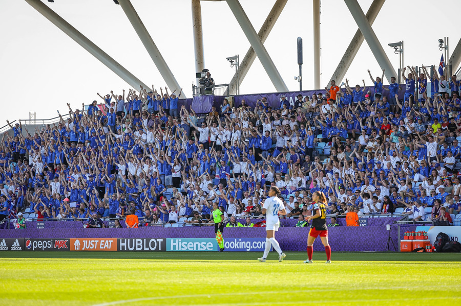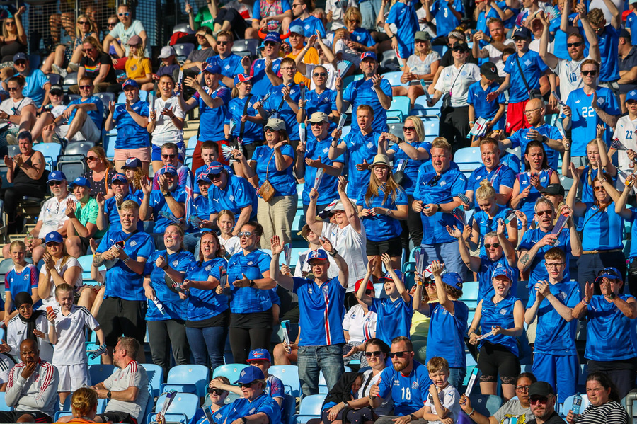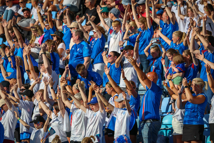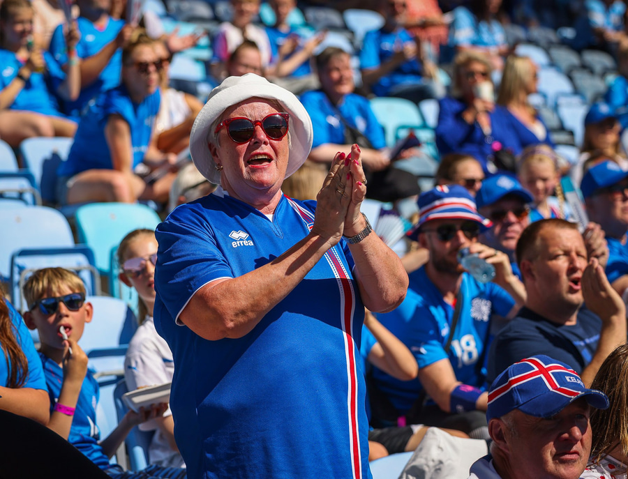 Tólfan heldur vel um taumana og stemningin er sérdeilis prýðileg hjá stuðningsfólki Íslands.