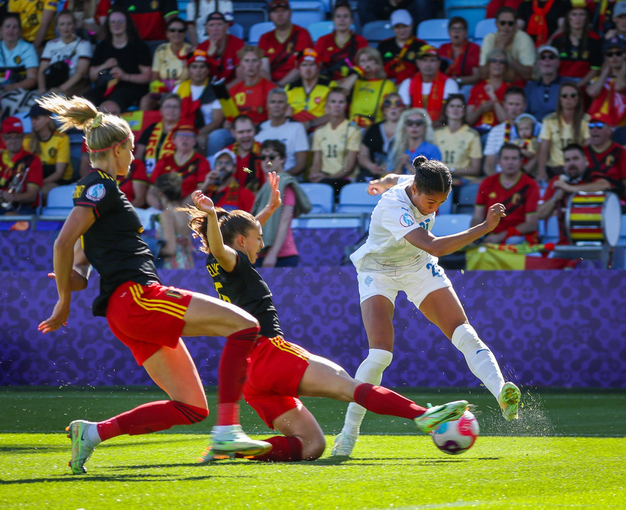 Það er eitthvað um peysutog og tilraunir sem fara í belgíska varnarmenn. Þetta endar svo á tilraun frá Glódísi sem fer yfir mark Belgíu.