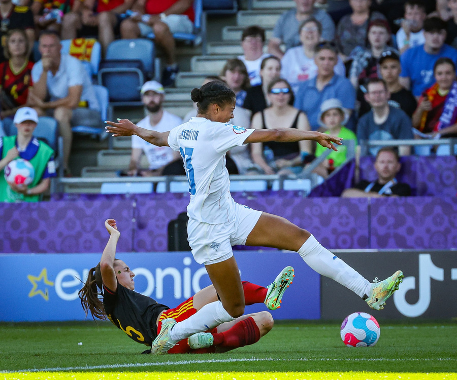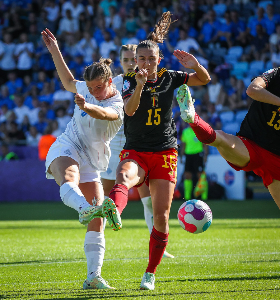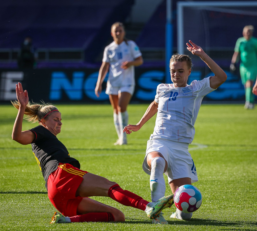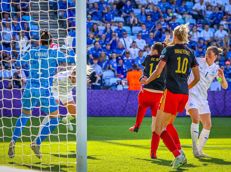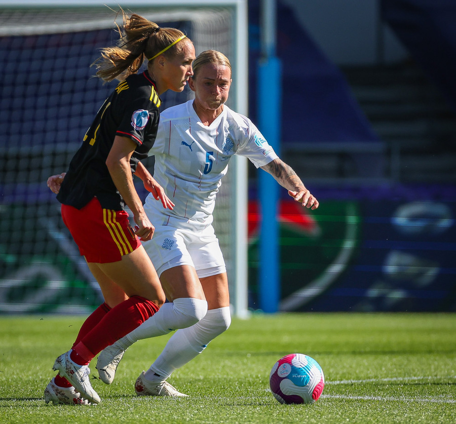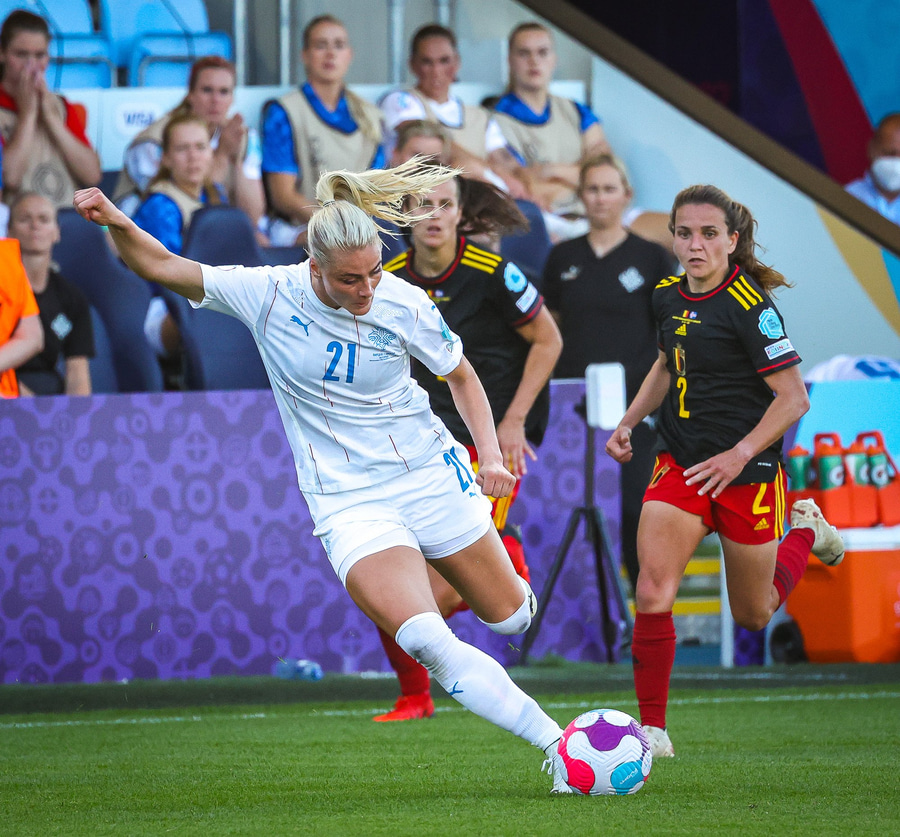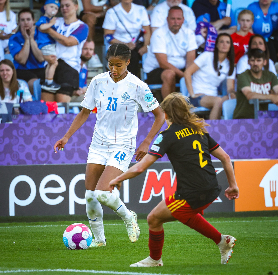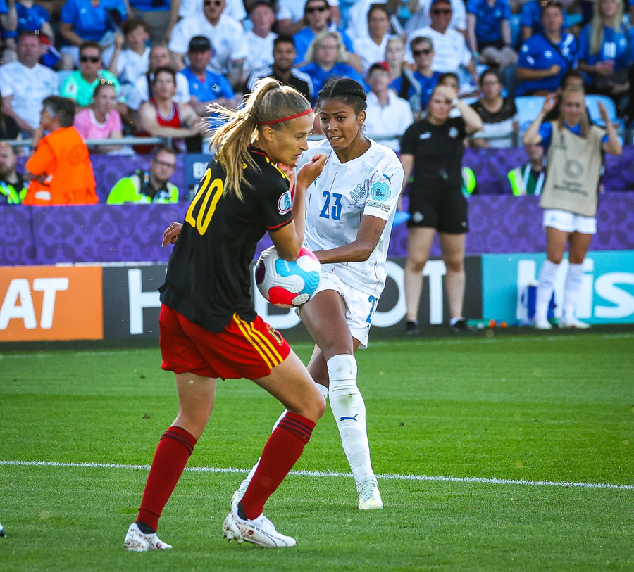 Skeiðar upp allan vallarhelming Belgíu og rúmlega það, stendur af sér eina tæklingu og kemst framhjá tveimur varnarmönnum. Hún á svo skot með vinstri fæti sem Evrard ver með sínum vinstri fæti og Ísland á horn.