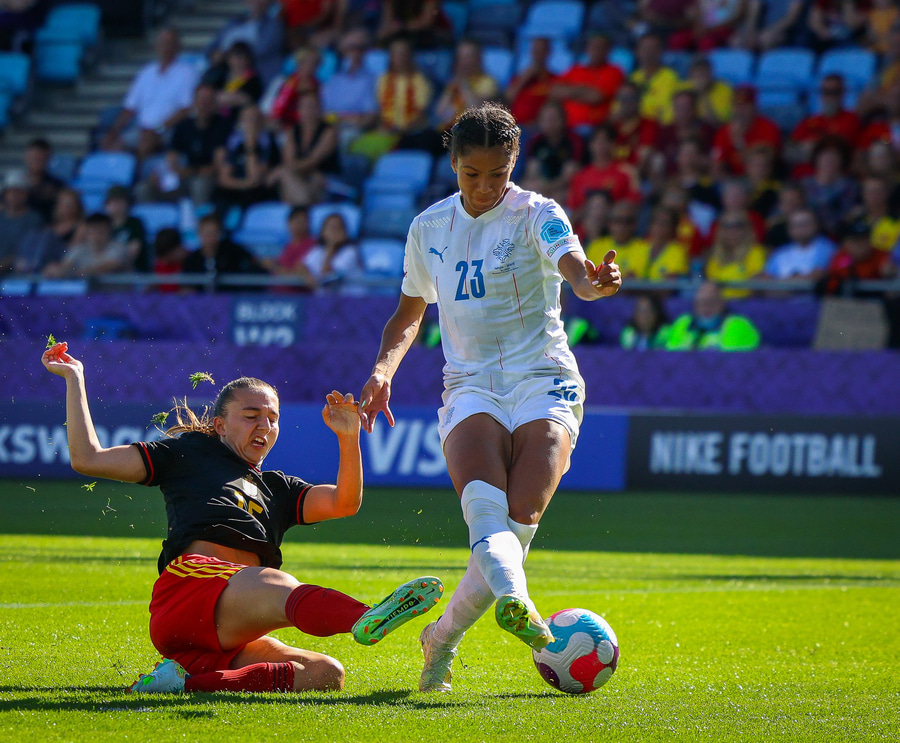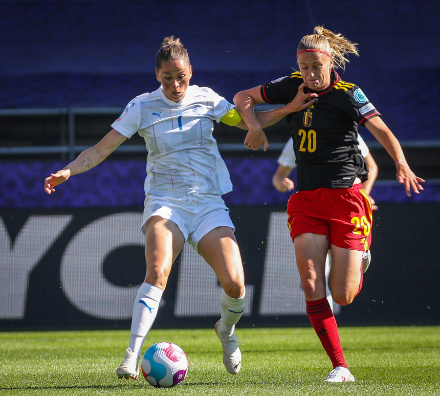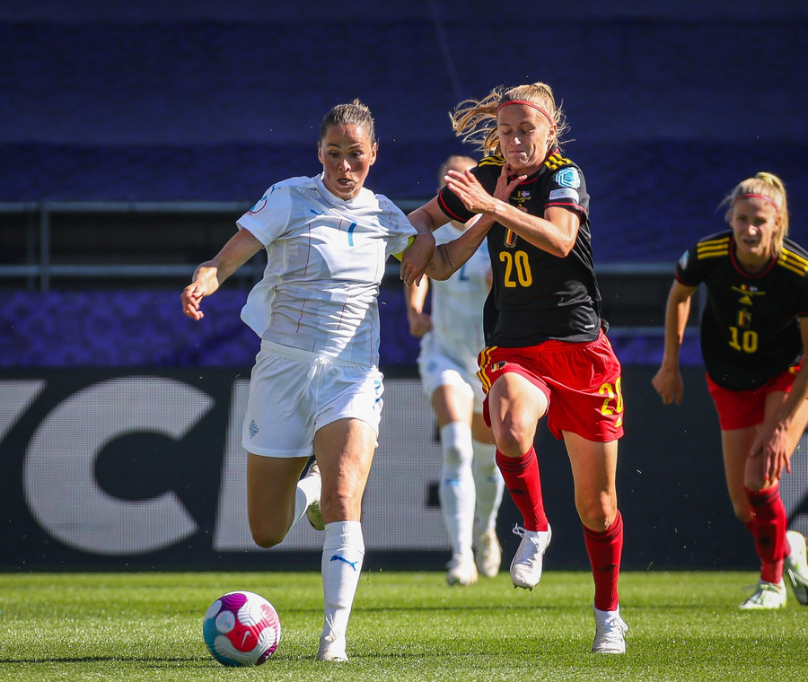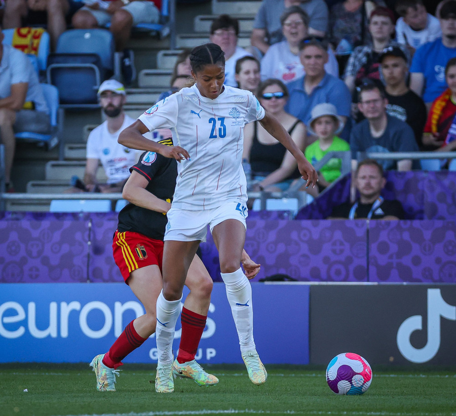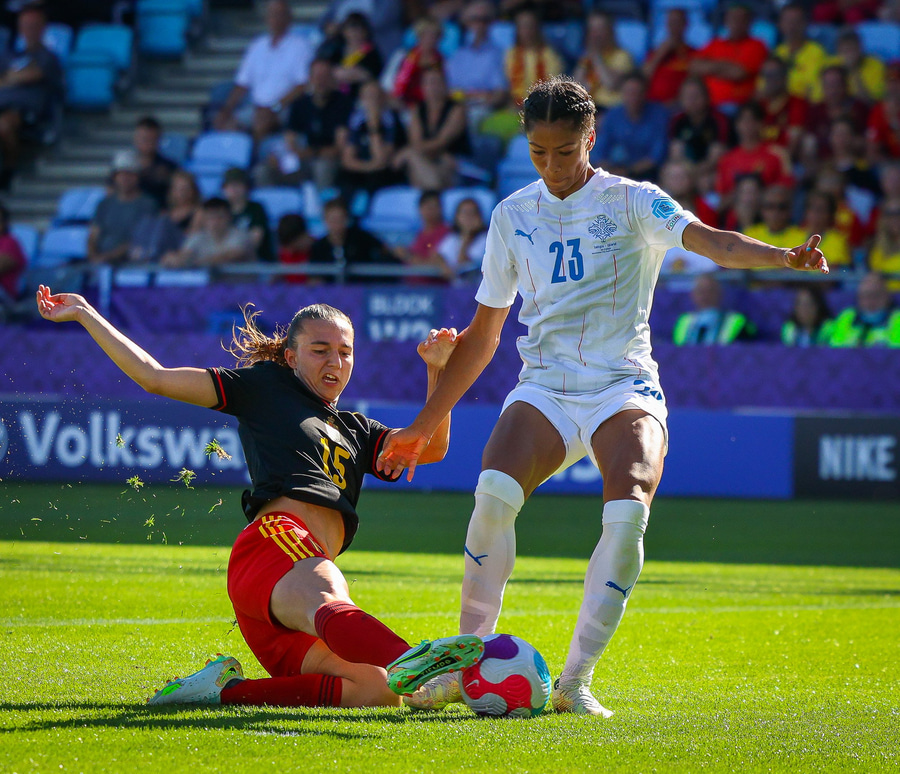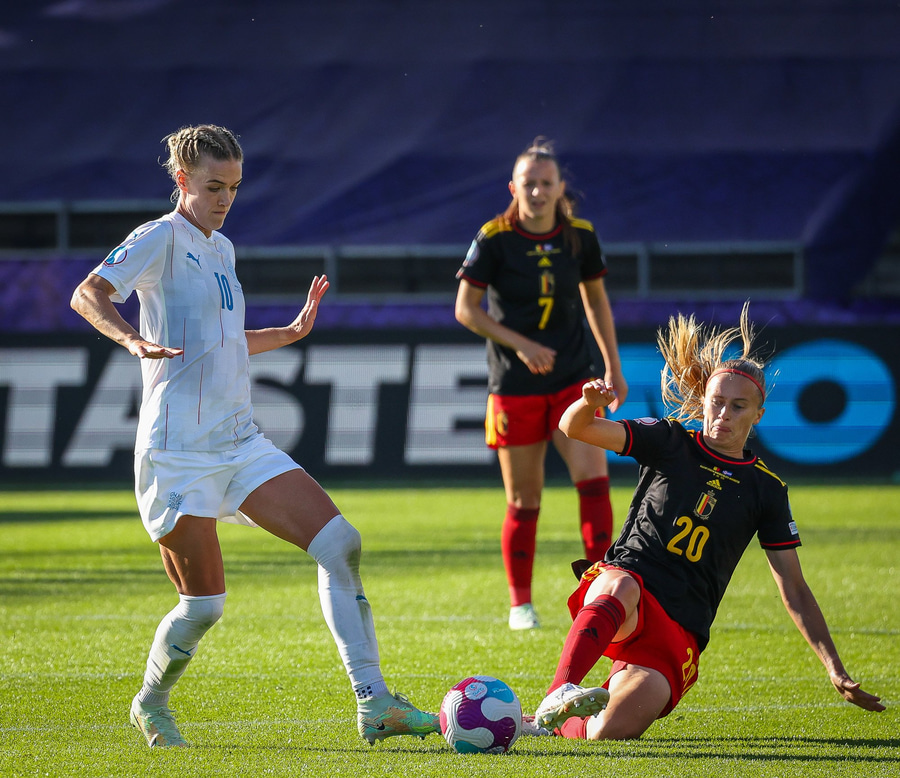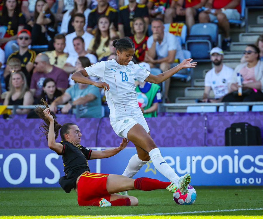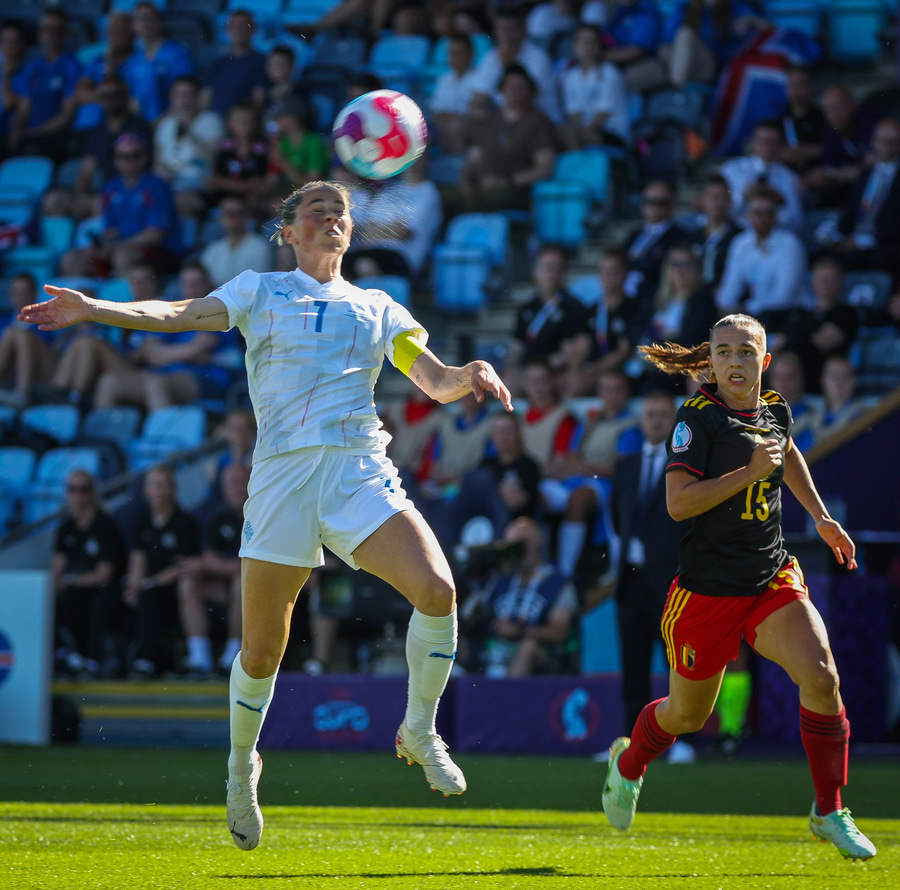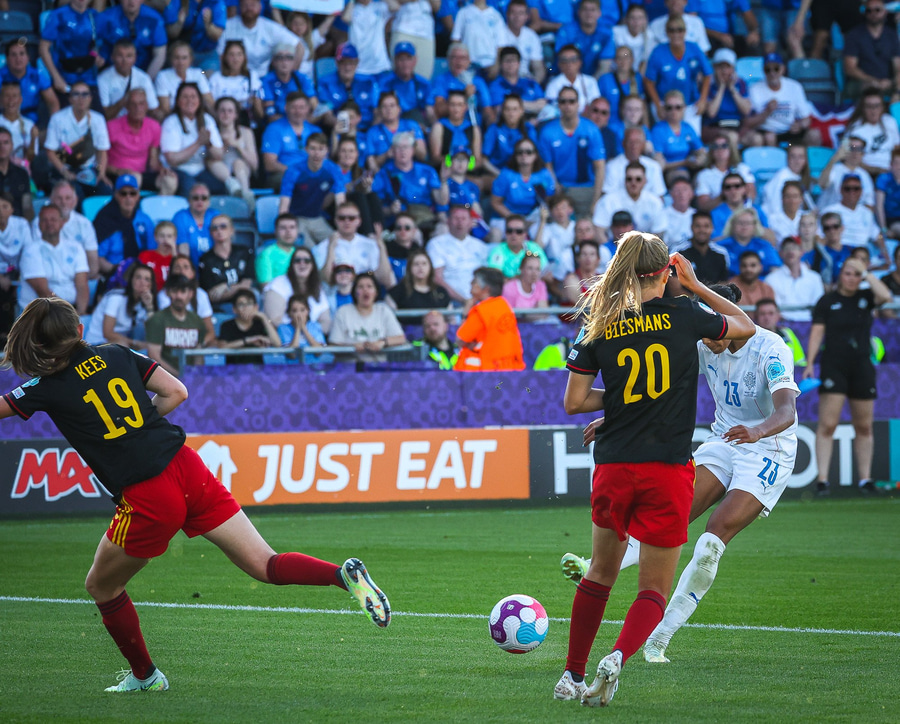 Skeiðar upp allan vallarhelming Belgíu og rúmlega það, stendur af sér eina tæklingu og kemst framhjá tveimur varnarmönnum. Hún á svo skot með vinstri fæti sem Evrard ver með sínum vinstri fæti og Ísland á horn.