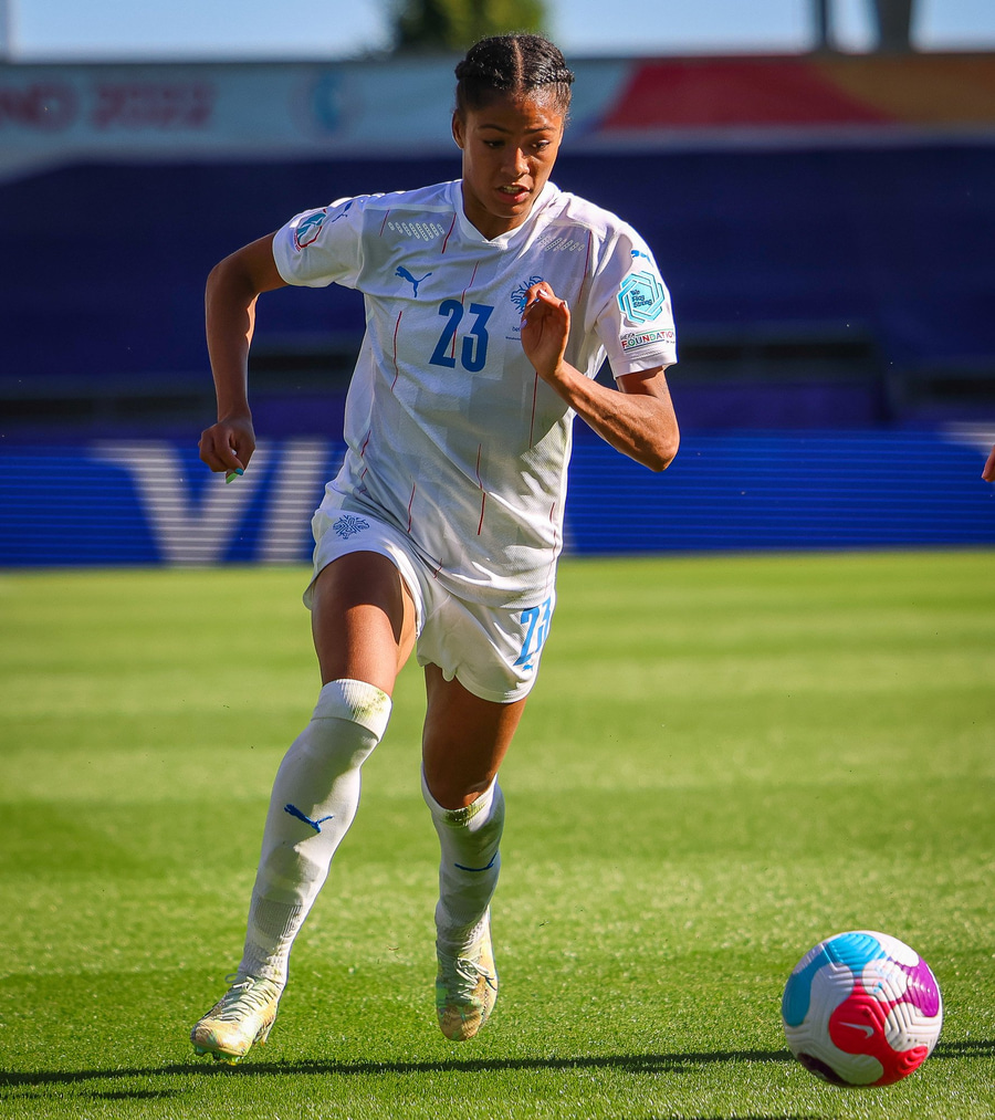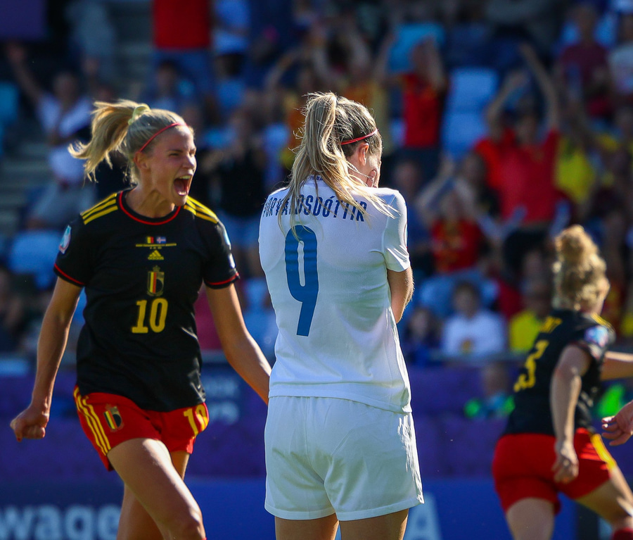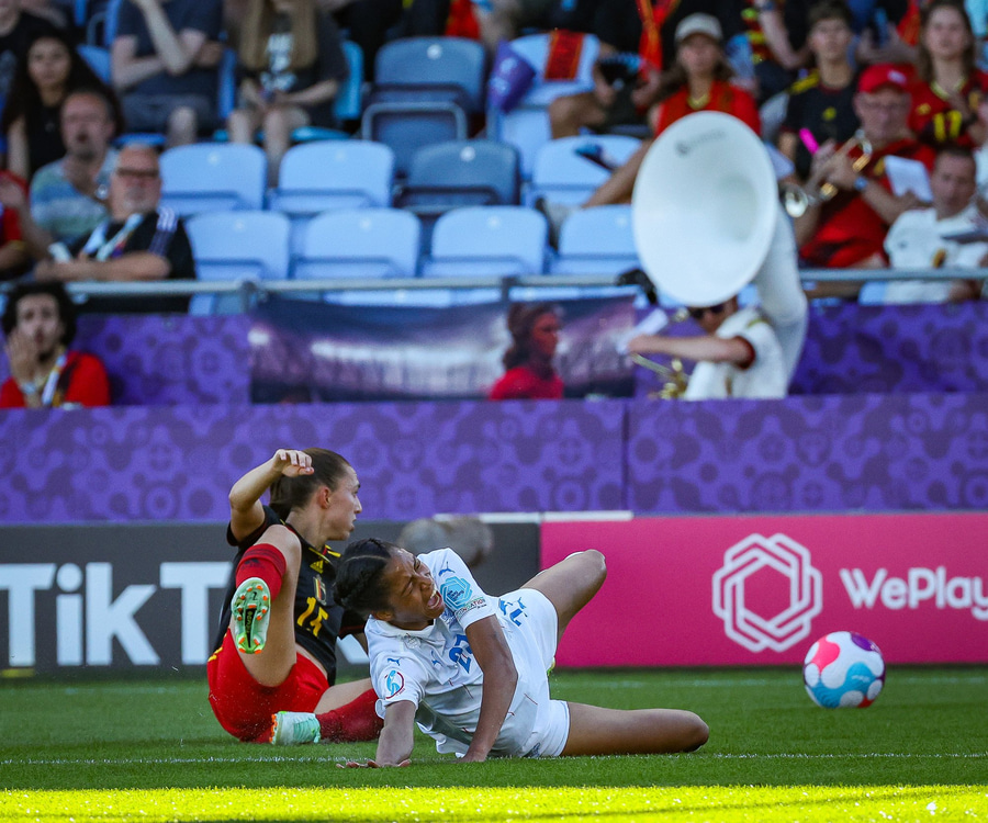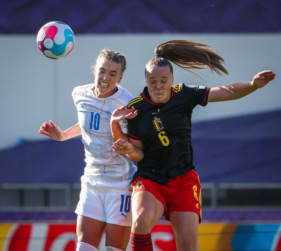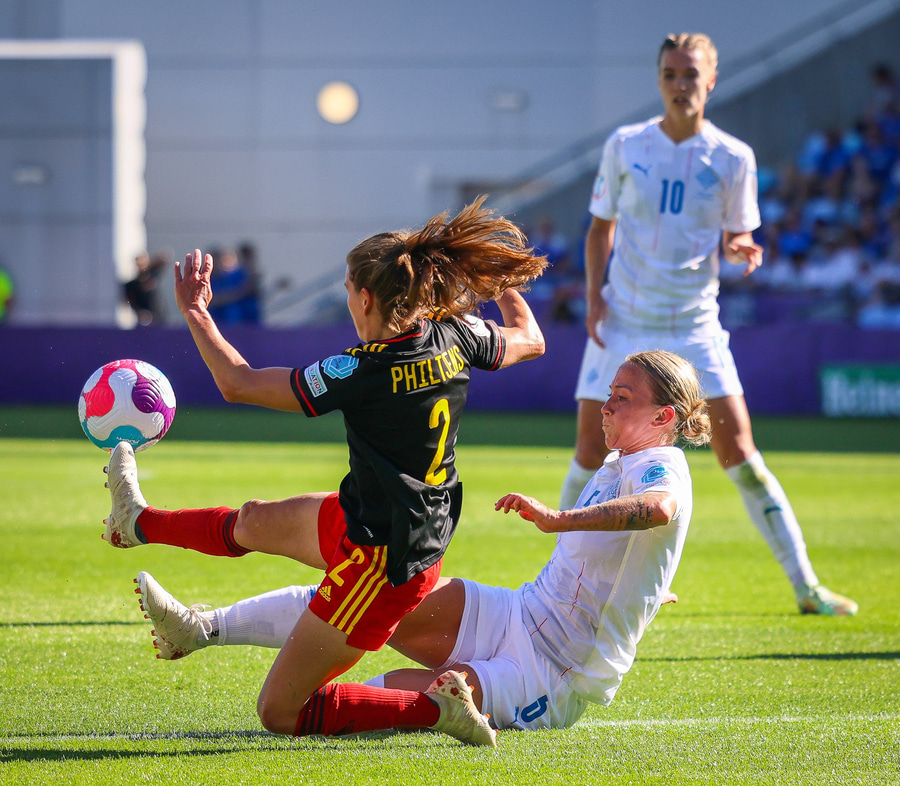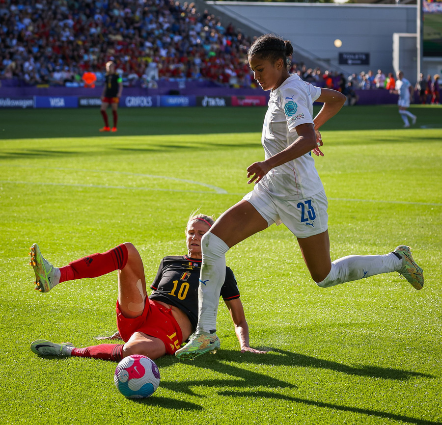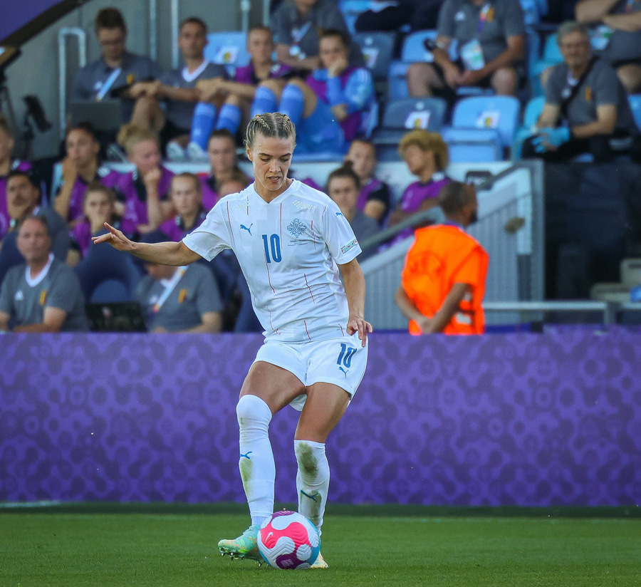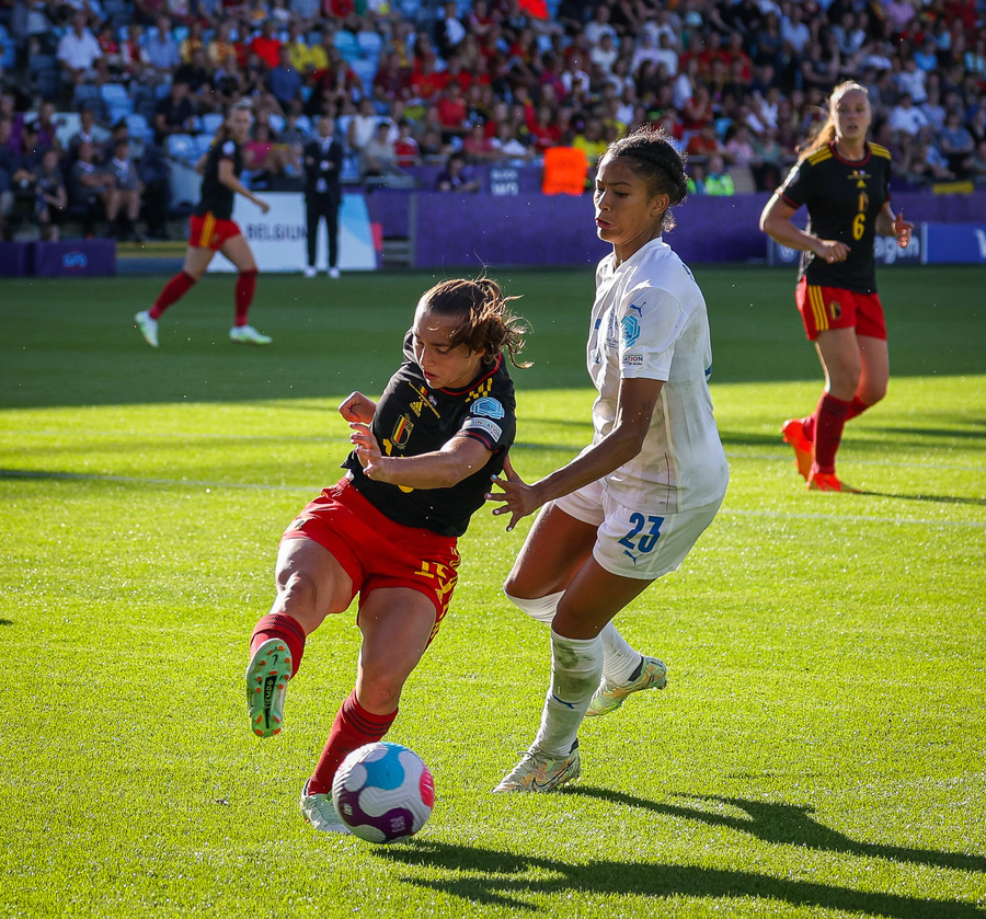 Skeiðar upp allan vallarhelming Belgíu og rúmlega það, stendur af sér eina tæklingu og kemst framhjá tveimur varnarmönnum. Hún á svo skot með vinstri fæti sem Evrard ver með sínum vinstri fæti og Ísland á horn.