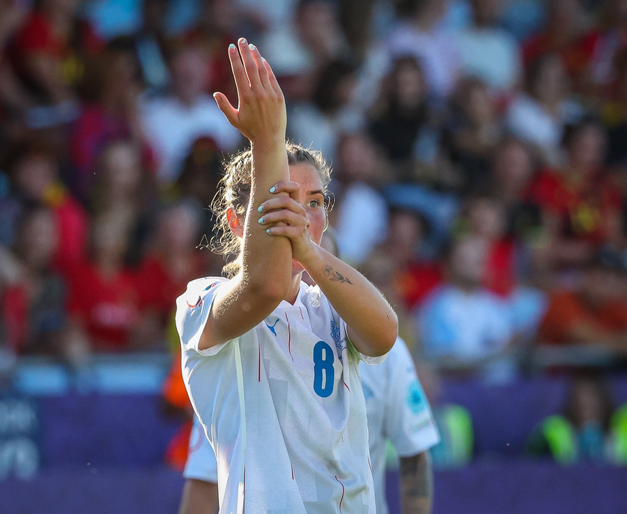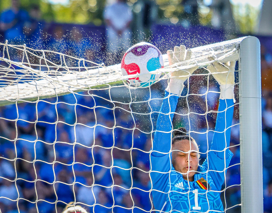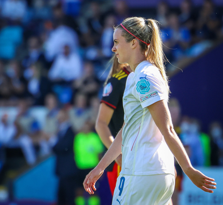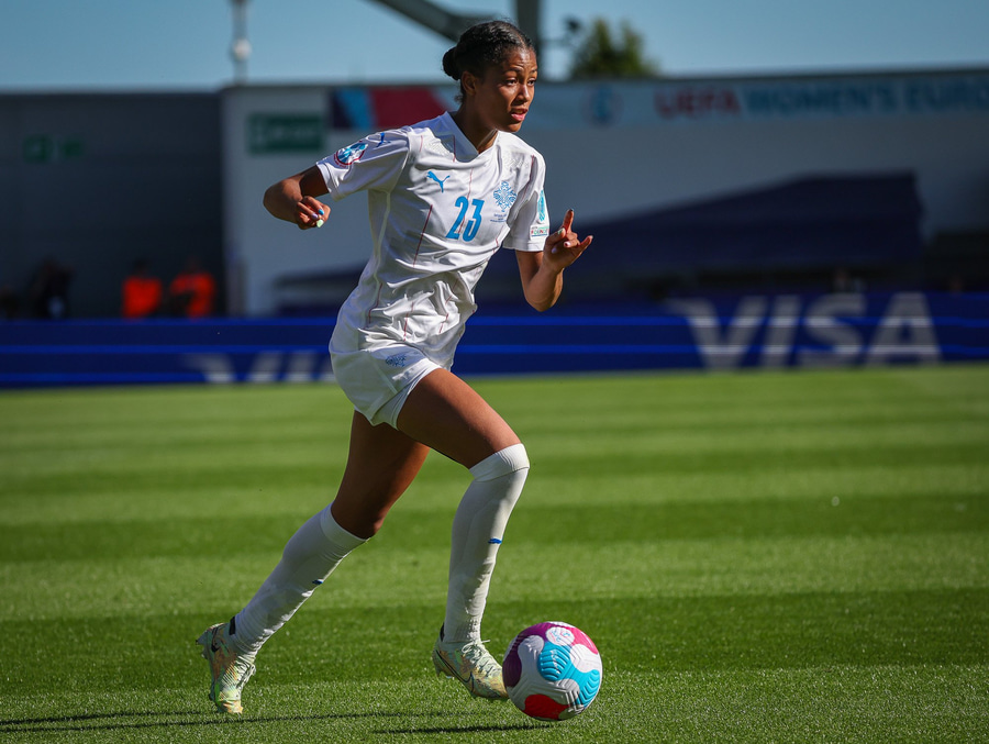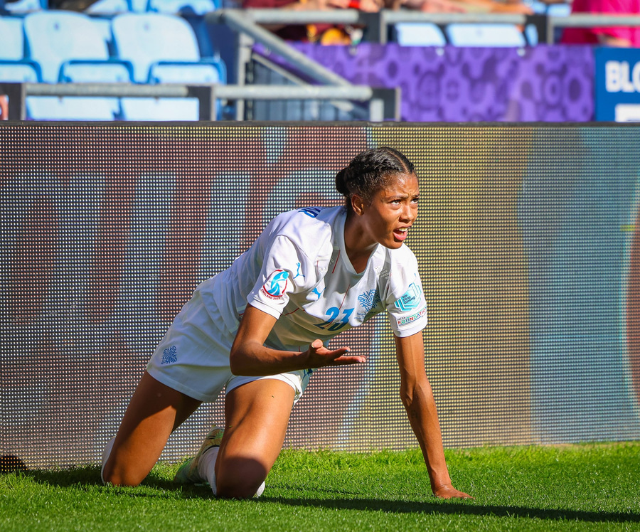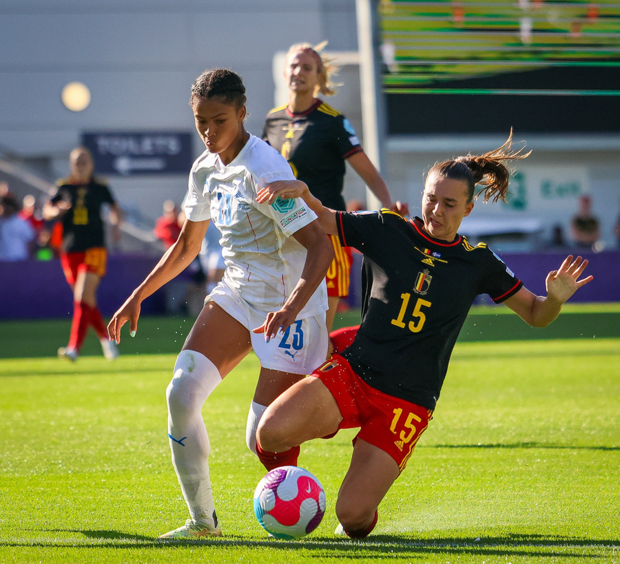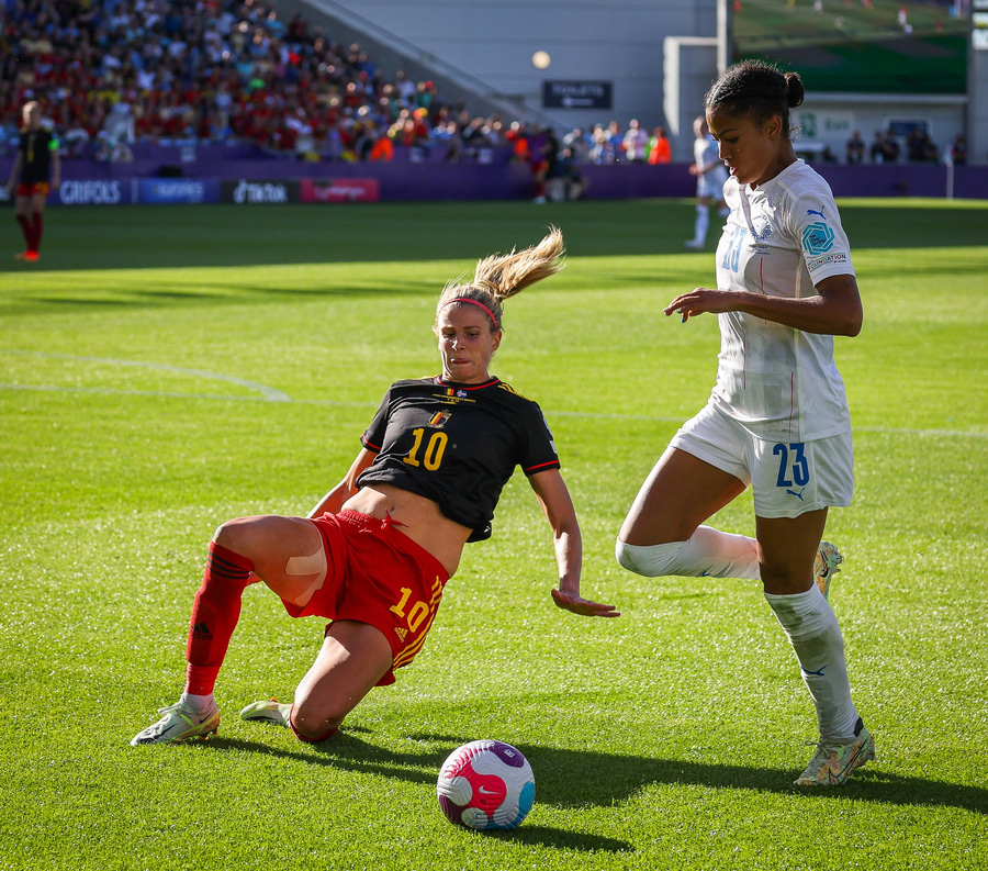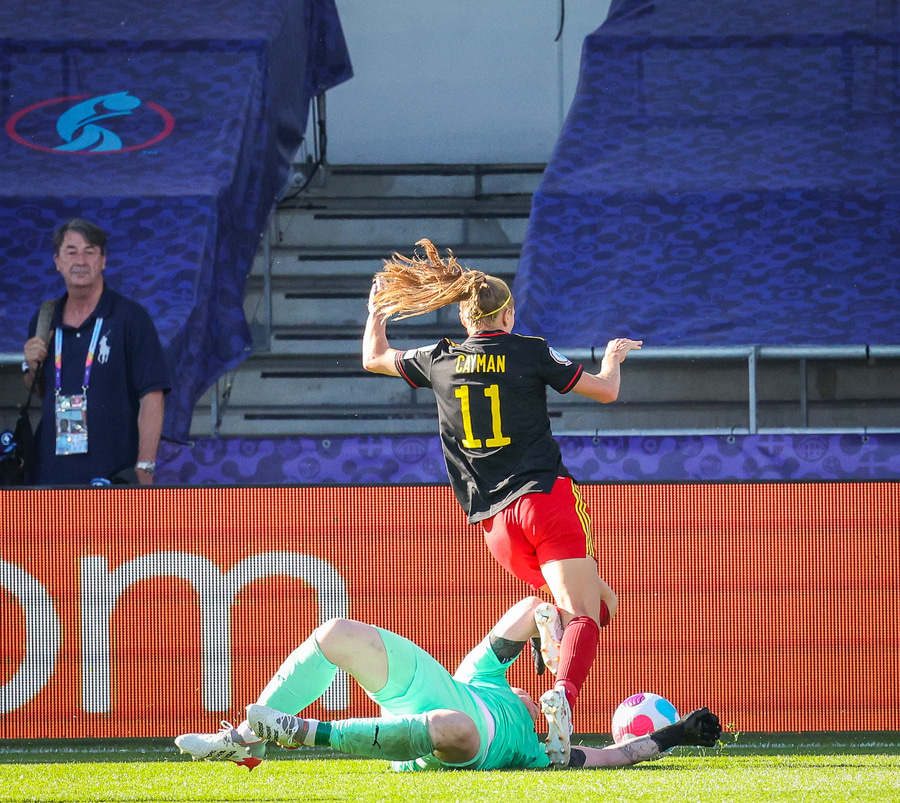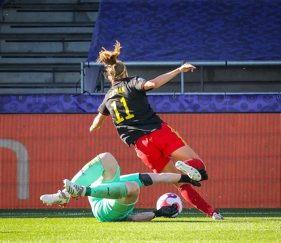 Skeiðar upp allan vallarhelming Belgíu og rúmlega það, stendur af sér eina tæklingu og kemst framhjá tveimur varnarmönnum. Hún á svo skot með vinstri fæti sem Evrard ver með sínum vinstri fæti og Ísland á horn.