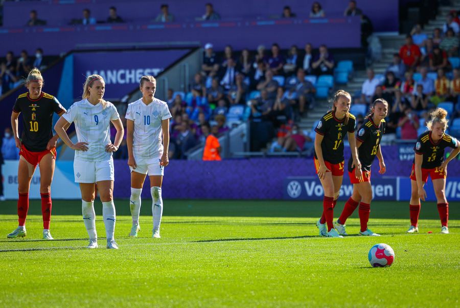 Besta leikflétta Belgíu í leiknum endar með því að Dhont fær boltann í teignum en blessunarlega fyrir Ísland þá hittir hún boltann illa og boltinn fer framhjá.