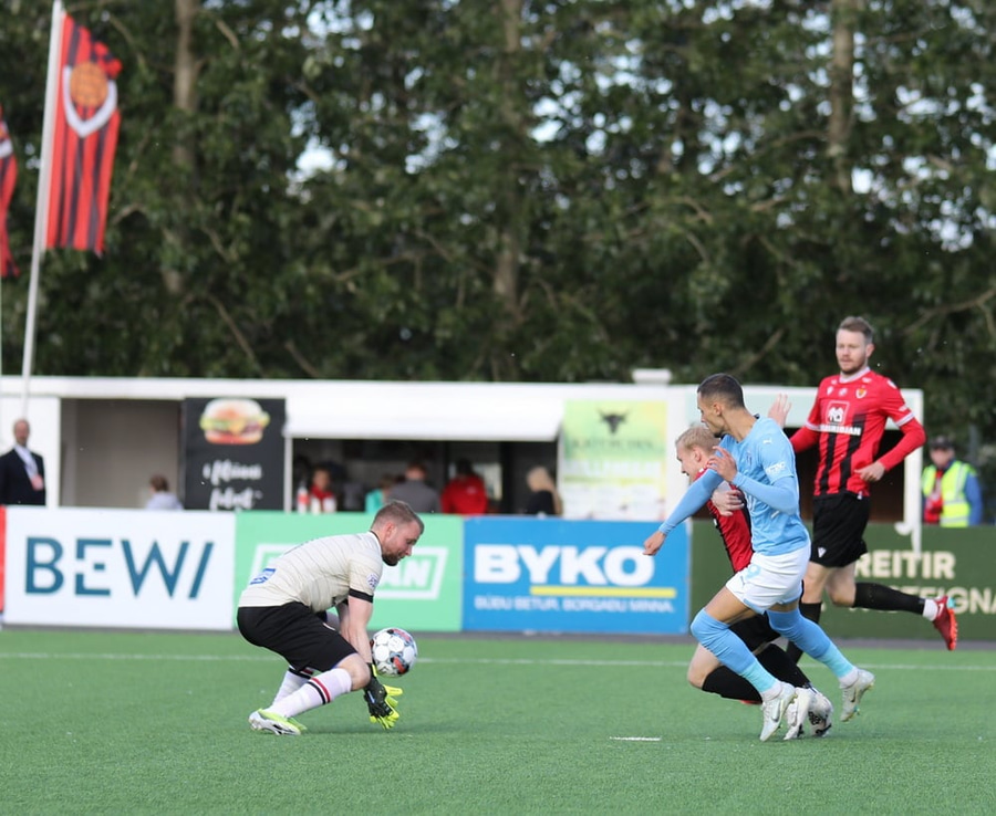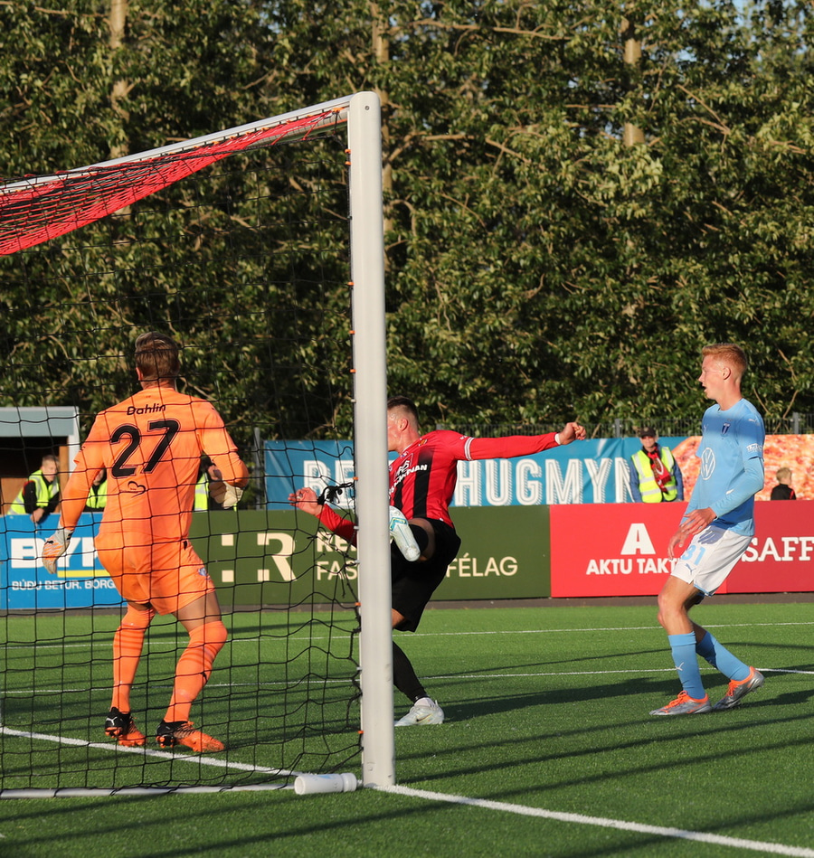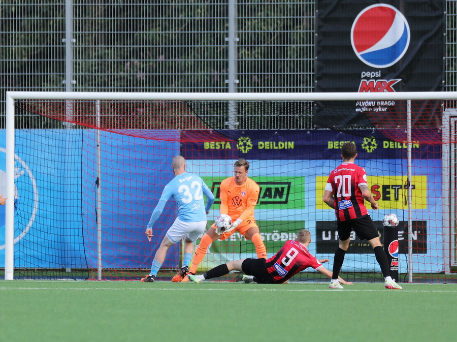 Kiese Thelin fær boltann við miðjuhringinn og nær að lauma boltanum á milli Halldórs og Ekroth á Birmancevic sem sleppir einn í gegn á móti Ingvari og setur boltann milli fóta Ingvars og í netið.