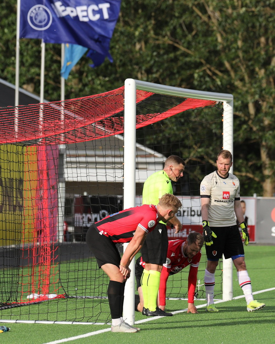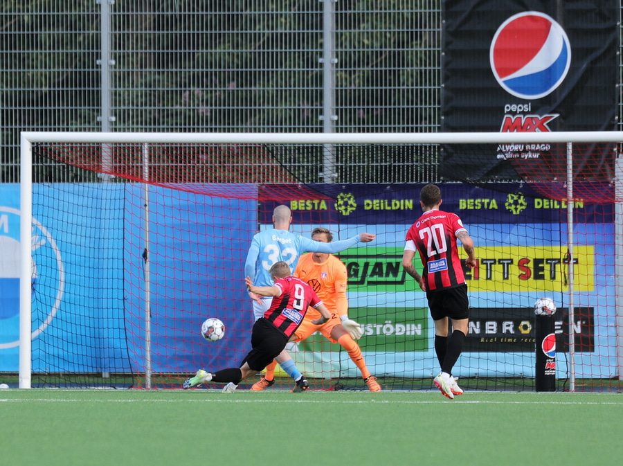 Pablo tekur stutta hornspyrnu á Viktor Örlyg sem leggur hann aftur á Pablo sem lyftir boltanum inn á teiginn á Nikolaj sem skallar boltann áfram á Karl Friðleif sem setur boltann í netið