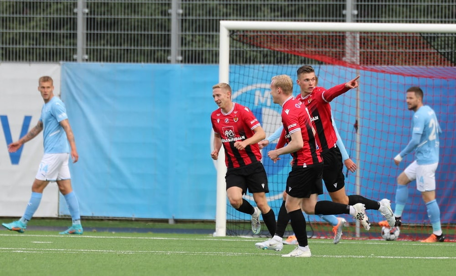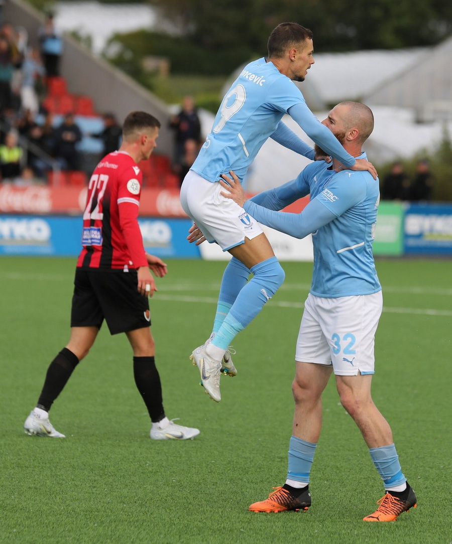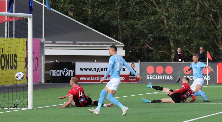 Felix Bejmo og Sergio Perna fara á langan þríhyrning og Bejmo fær boltann við teiginn og rennir boltanum fyrir markið og þar mætir fyrirliði Malmö og rennir boltanum í netið.