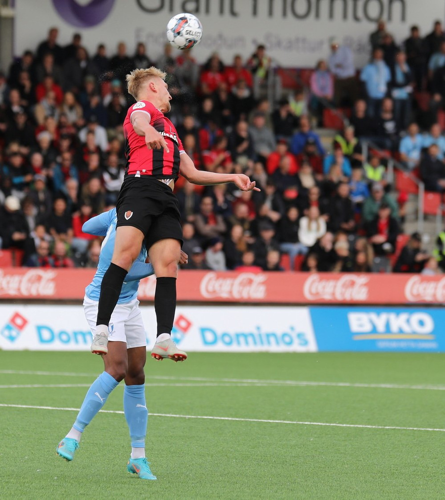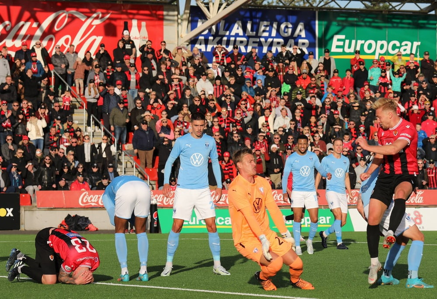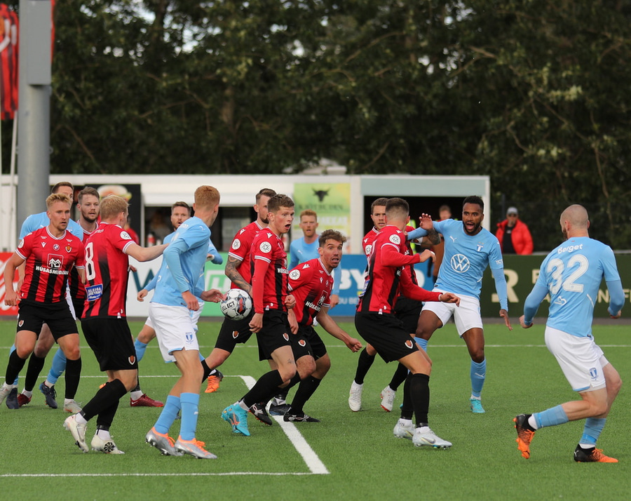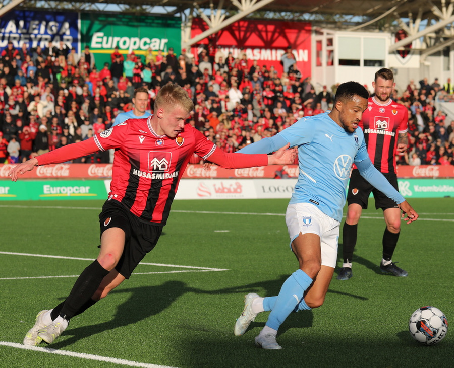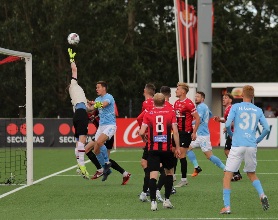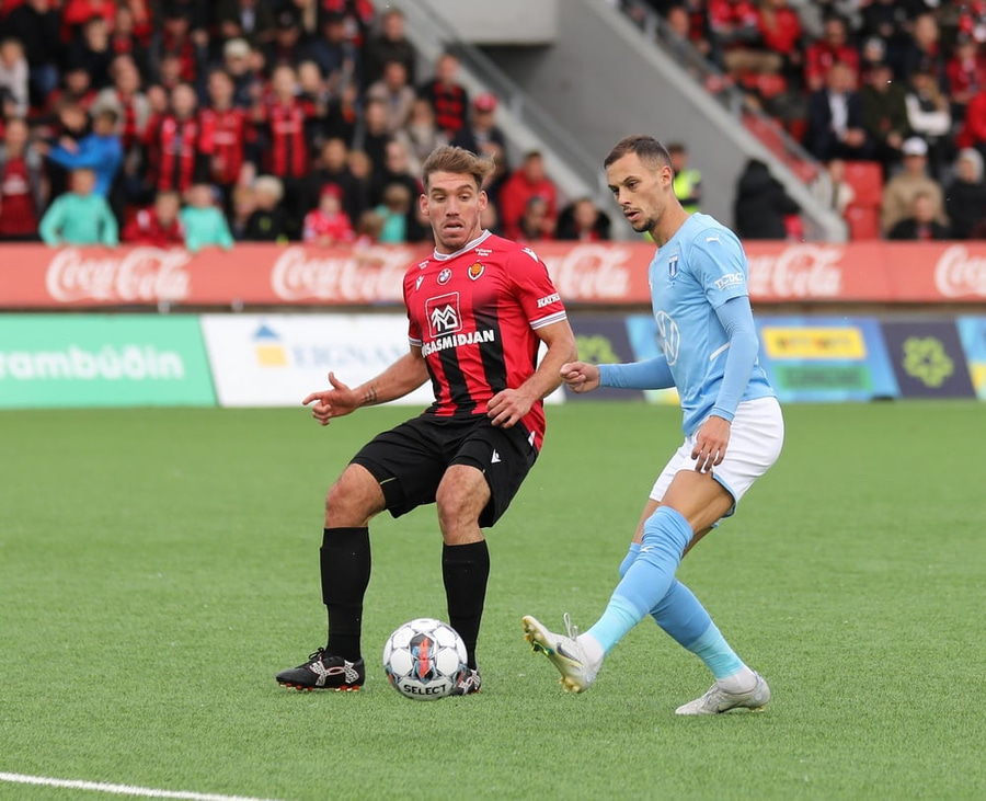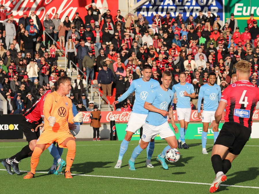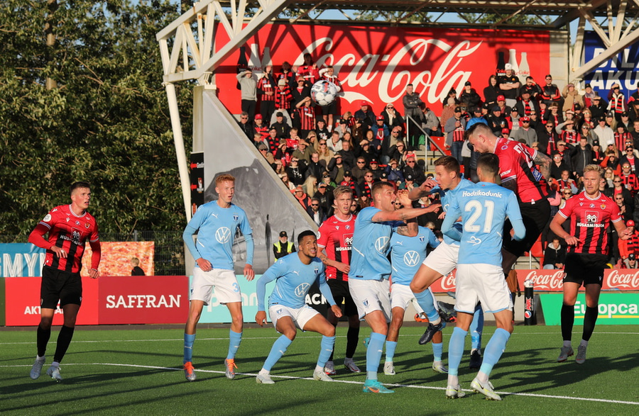 Pablo tekur spyrnuna sem Malmö skalla boltann í burtu en Erlingur nær til boltans og nær skoti og boltinn fer af varnarmanni og á Karl Friðleif sem nær fyrirgjöf í átt að Nikolaj sem nær ekki að skalla boltann í netið.