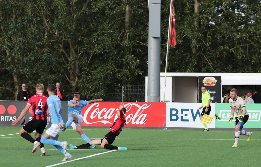 Sergio Pena fær boltann og lyftir boltanum út til vinstri í hlaup á Felix Beijmo sem sleppur einn í gegn og setur boltann í netið.