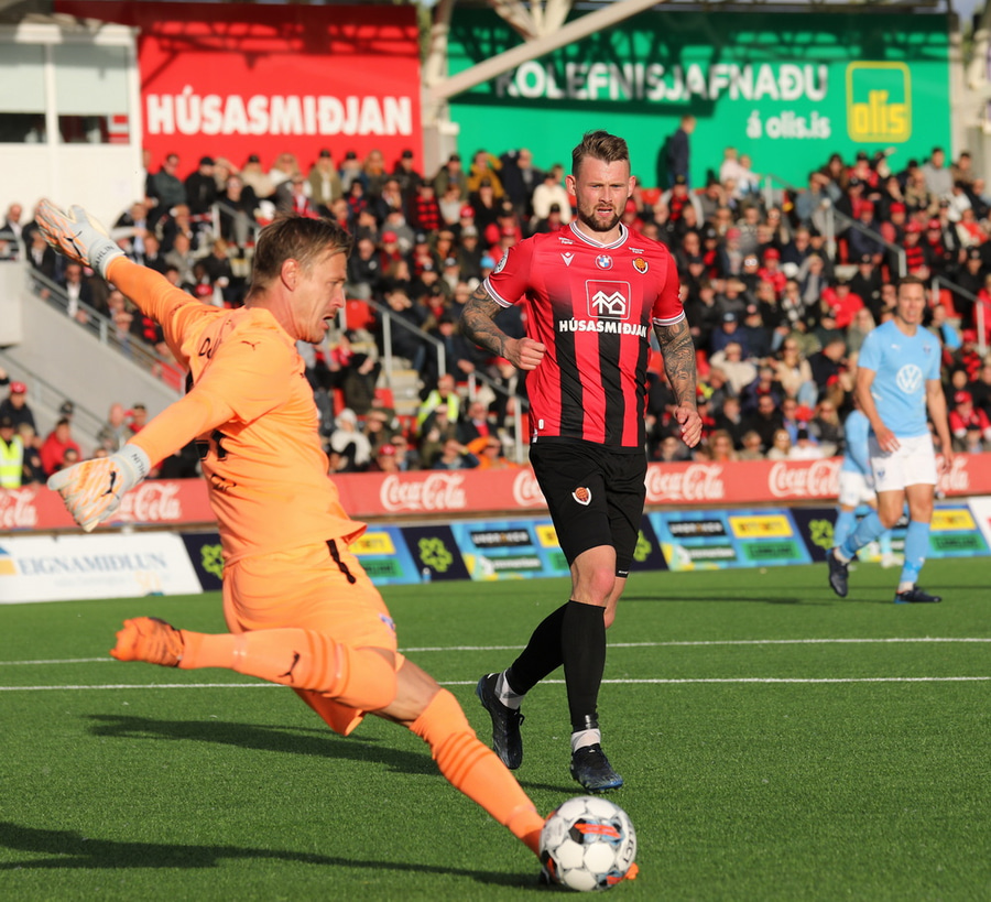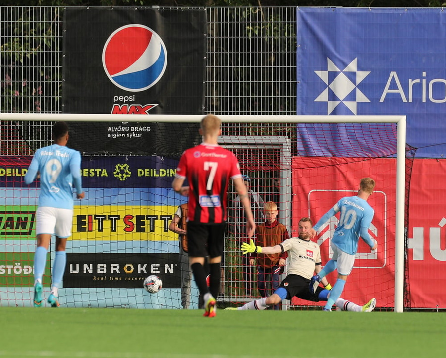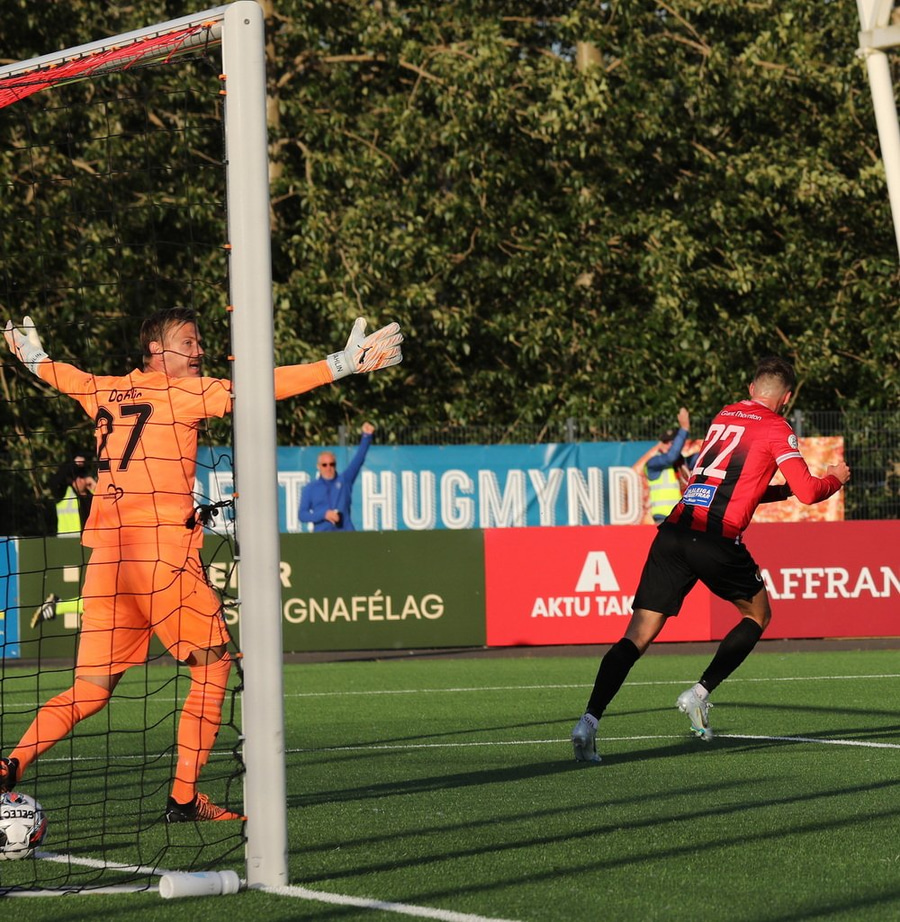 Davíð Örn fær boltann út til vinstri og á frábæran bolta inn á teiginn. Nikolaj tekur vel við honum áður en hann leggur boltann í netið.