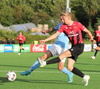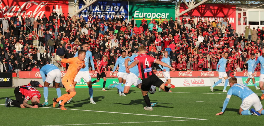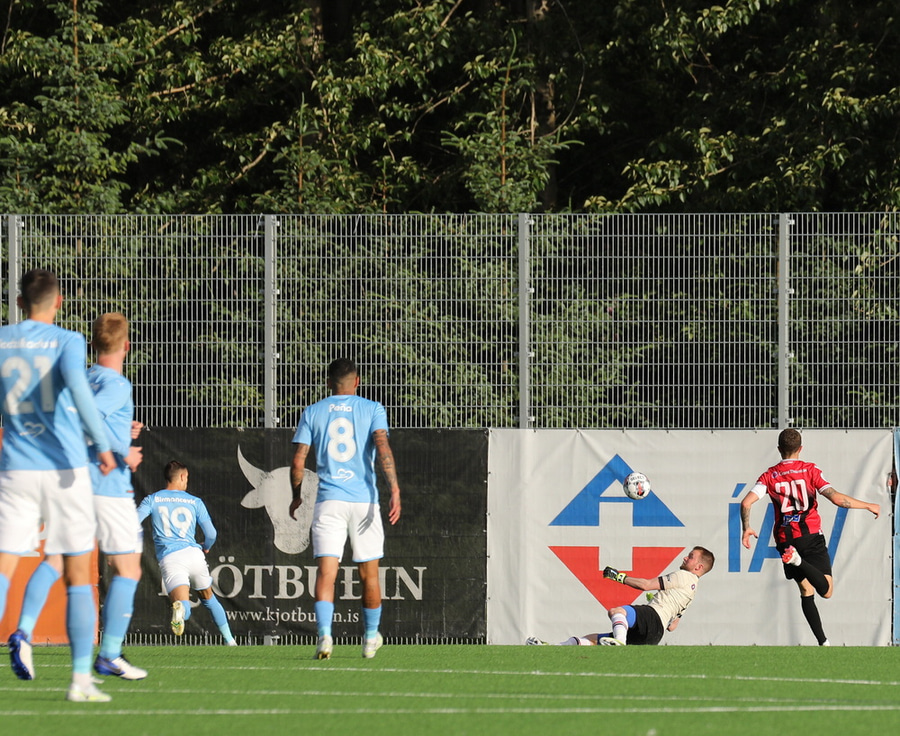 Karl Friðleifur fær boltann út til hægri og finnur Ara við teiginn og Ari nær skoti og boltinn af varnarmanni og afturfyrir.