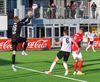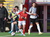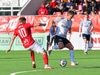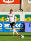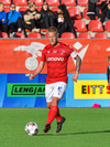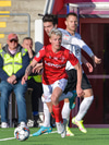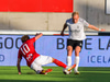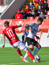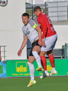 Haukur Páll kemur á ferðinni og reynir að tækla boltann en er of seinn og fer í Björn Daníel og Erlendur færir Hauk til bókar hér.