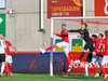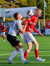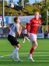 Haraldur Einar lyftir boltanum inn á teiginn og boltinn dettur fyrir fætur Kidda sem rennir honum til hliðar í hlaup á Oliver Heiðarsson sem kemur með góðan bolta á Matta en Schram ver.