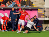 Schram virðist hafa fengið þennan bolta beint í andlitið en virðist í lagi.