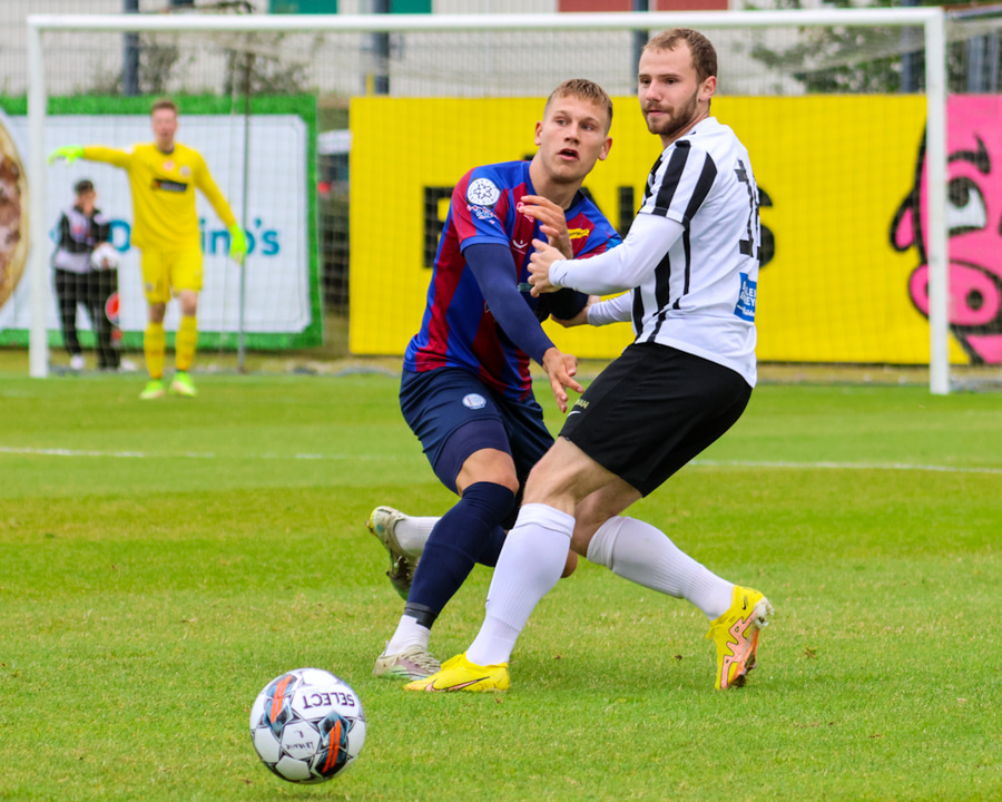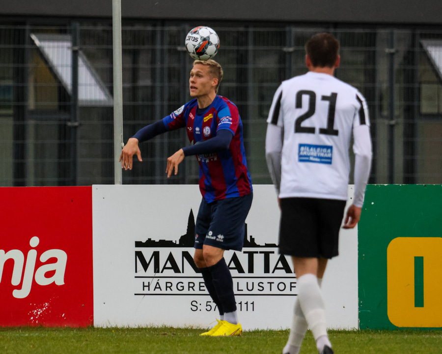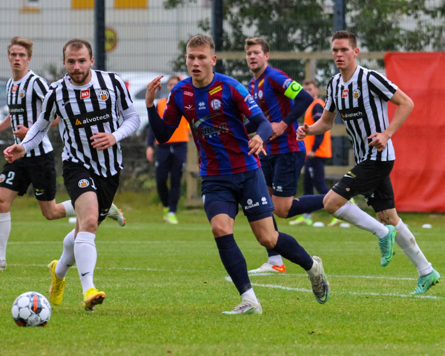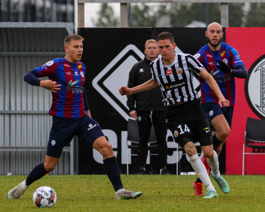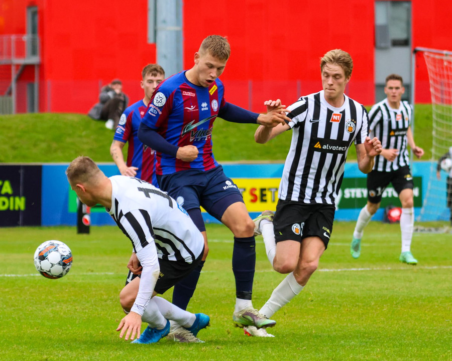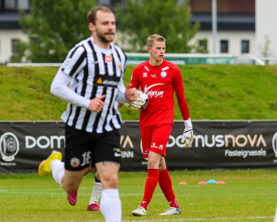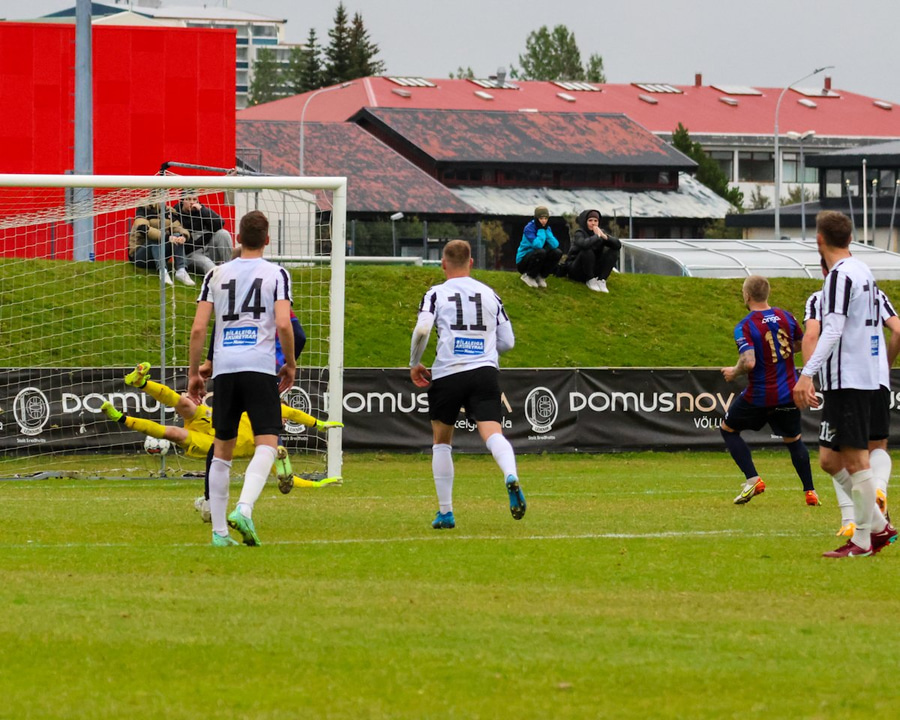 Kjartan neglir boltanum niðri í vinstra hornið, Viktor á ekki séns.