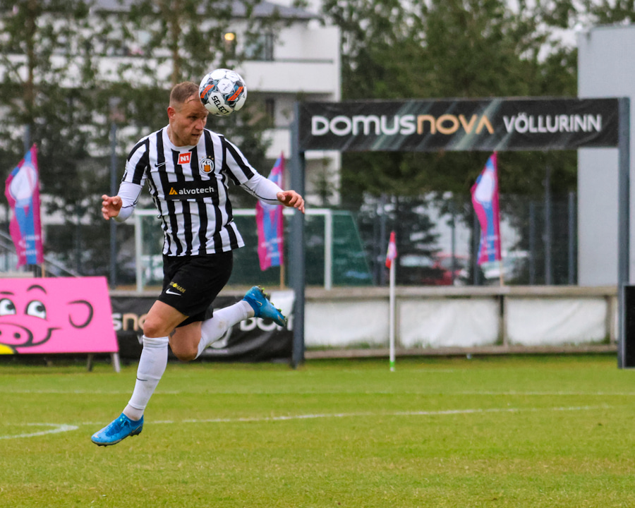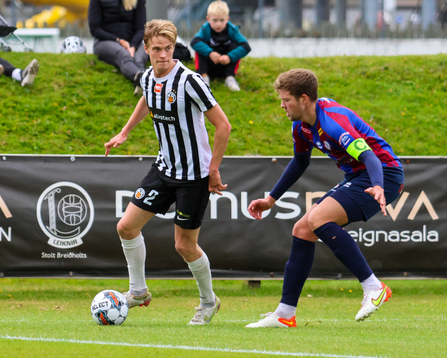 Sigurður Bjartur fær fyrirgjöf frá Atla Sigurjóns og tekur skot á markið á lofti en Viktor Freyr ver skotið þægilega.
