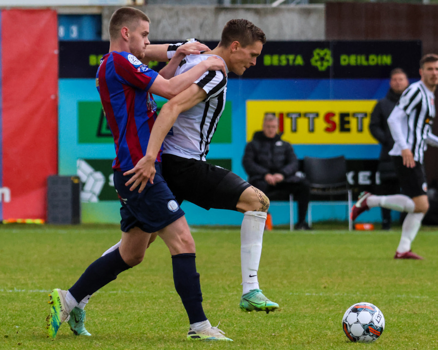 Kennie Chopart með neglu á markið fyrir utan teig en Viktor Freyr ver frábærlega og í horn.