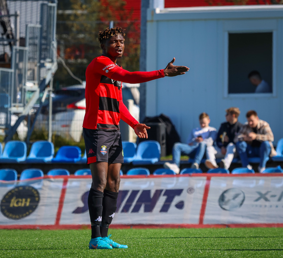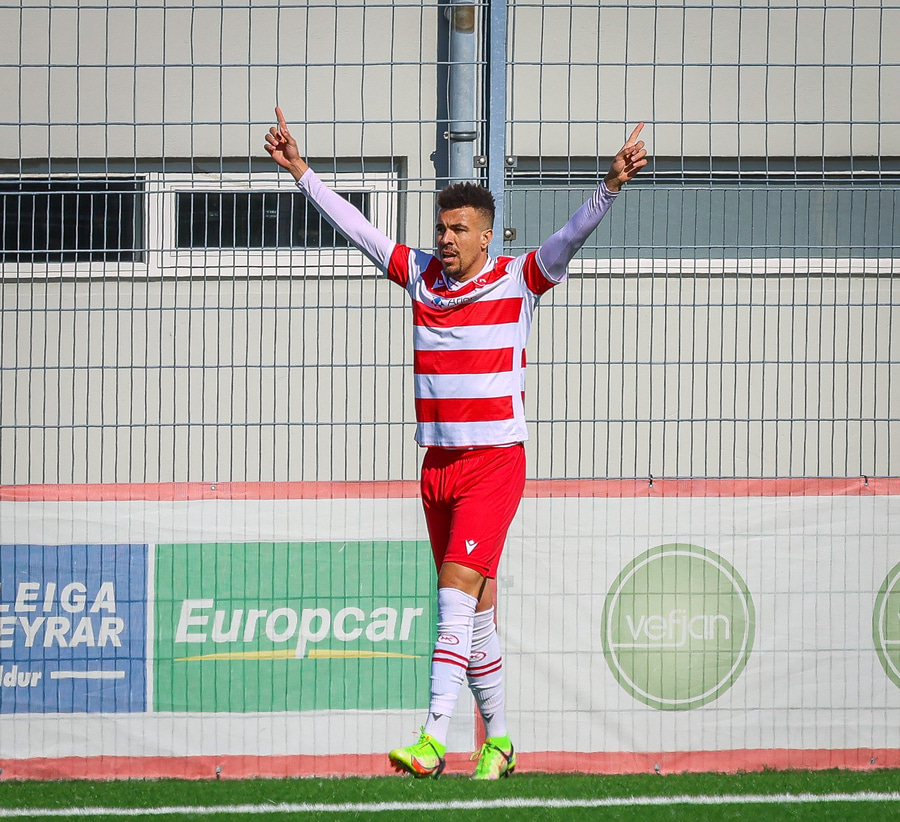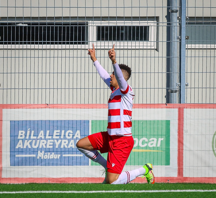 Þvílíkur skalli! Loic Ondo skallaði boltann í skeitin og inn. Arnleifur Hjörleifsson tók hornspyrnu frá vinstri með vinstri fæti. Boltann skallaði Loic úr miðjum teignum.