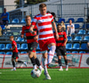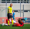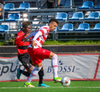 Hassan Jalloh einn á móti Daða Frey í marki Kórdrengja. Vinkillinn örlítið þröngur þegar Daði kom út og lokaði vel á hann. Daði varði skot Hassan vel.