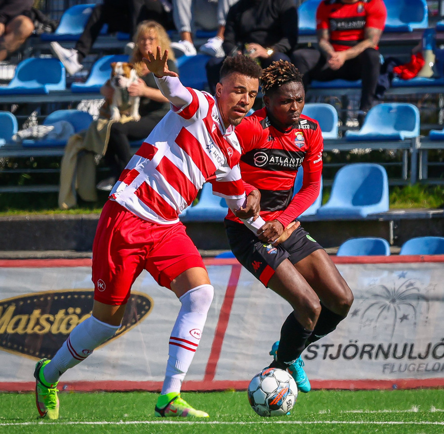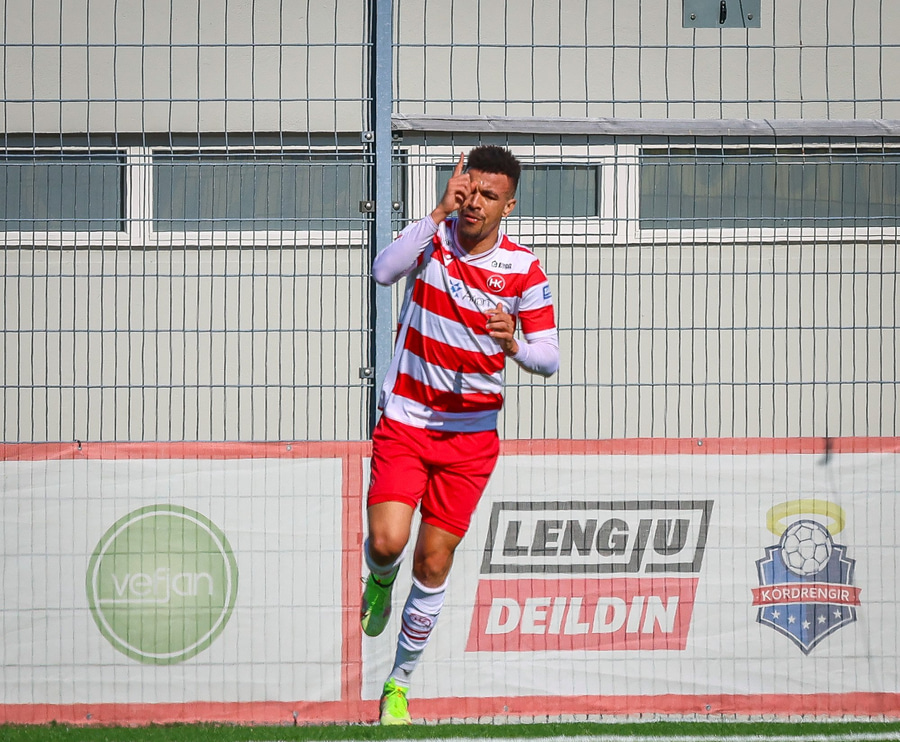 Hassan Jalloh kláraði færið sitt vel niður í vinstra hornið hægra megin úr teignum. HK setti langan bolta fram völlinn, yfir vörn Kórdrengja sem brást of seint við. Hassan átti bara eftir að leggja boltann fyrir sig og klára færið einn og óvaldaður.