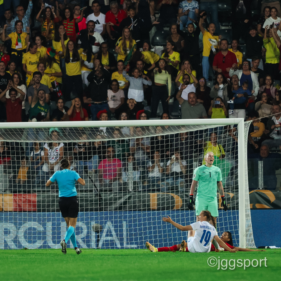 Áslaug Munda með aukaspyrnu inn í teiginn, markvörður Portúgals grípur í tómt og boltinn dettur á Gunnhildi Yrsu í teignum. Hún gerir vel en setur boltann í slána! Þarna munaði rosalega rosalega litlu.