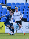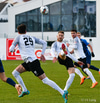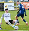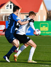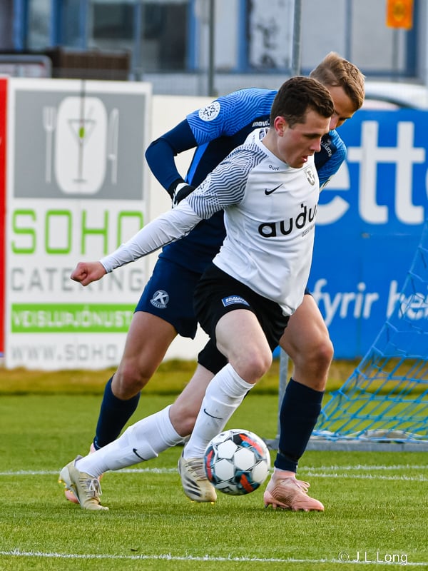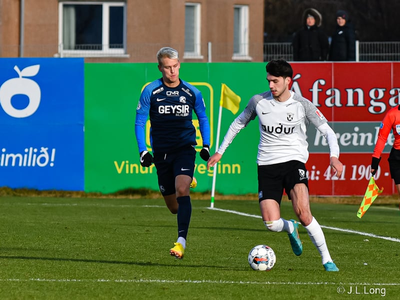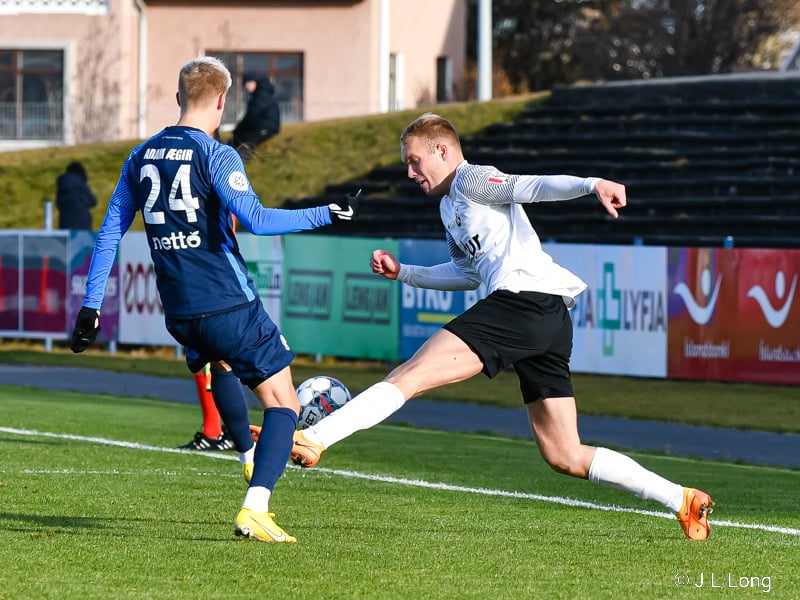 Adam Ægir með boltann fyrir úr þröngri stöðu, Atli hársbreidd frá því að missa boltann undir sig en tekst að bjarga á endanum.