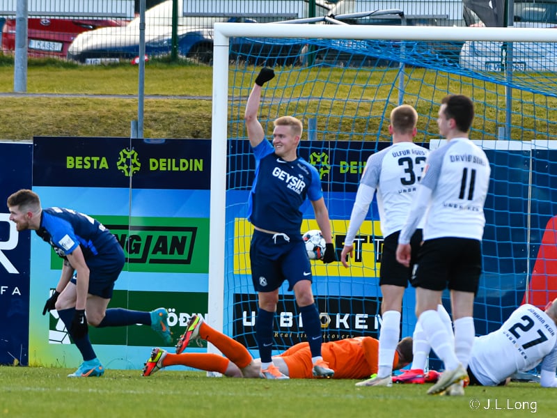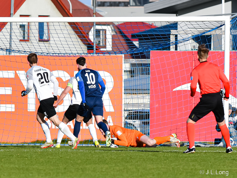 Kastar boltanum út beint á Patrik sem kemur æðandi að markinu, Patrik tekur skotið sem Atli ver beint fyrir fætur Adams sem á fyrst skot í varnarmann en fær boltann aftur og setur boltann í netið af stuttu færi.