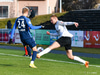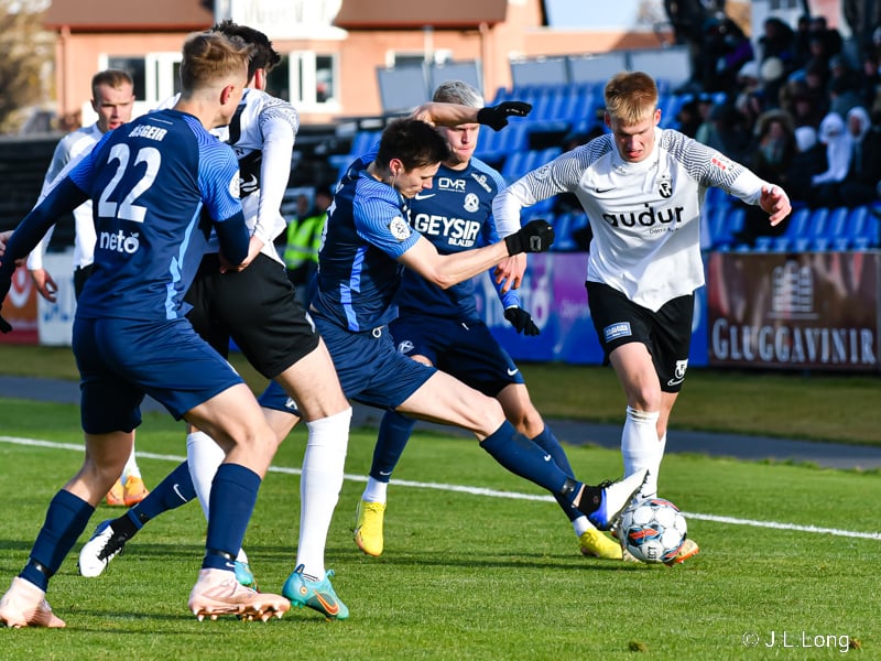 Oliver Heiðarsson með boltann í teignum úti til hægri. Reynir skotið en varnarmaður hendir sér fyrir og boltinn í horn.