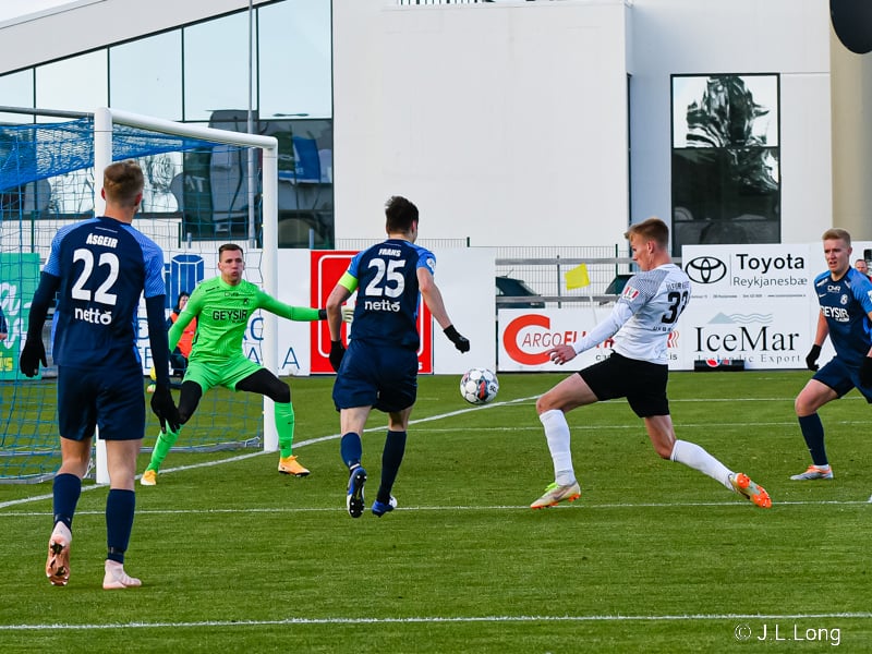Joey Gibbs í algjöru dauðafæri en hittir ekki boltann. Virtist of upptekin af því að biðja um víti fyrir brot á Ásgeiri Páli sem kom boltanum á hann af harðfylgi.