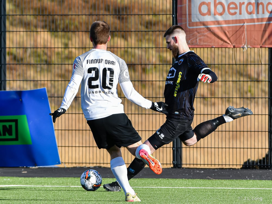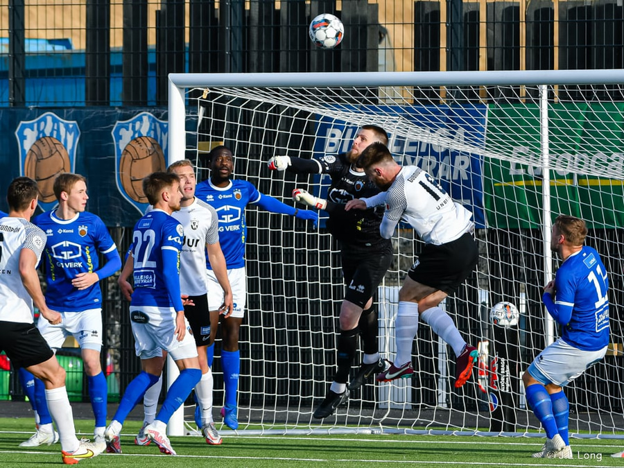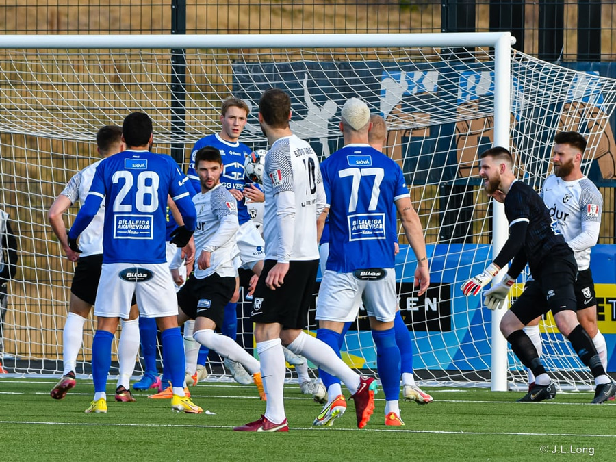 Uppfært: Aukaspyrnan er á fjær í átt að Gumma Magg sem nær ekki til boltans og markspyrna niðurstaðan.
