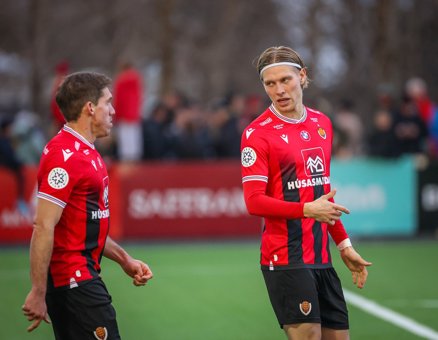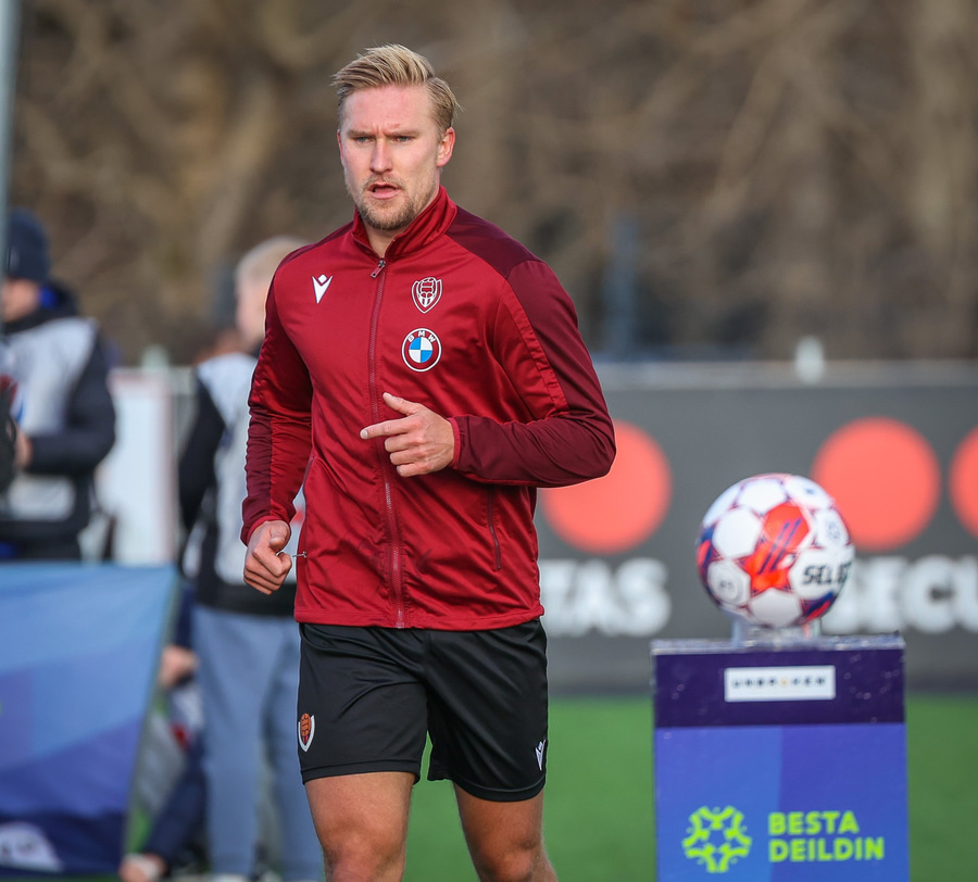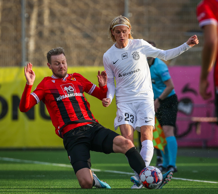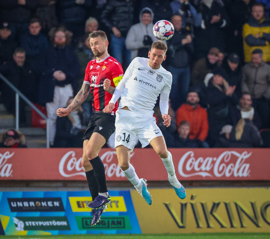 Víkingar setja einn langan fram sem sendir bæði Loga og Hansen alveg eina í gegn. Kjellevold er hinsvegar fljótur að hugsa og kemur vel út úr markinnu til að hreinsa.