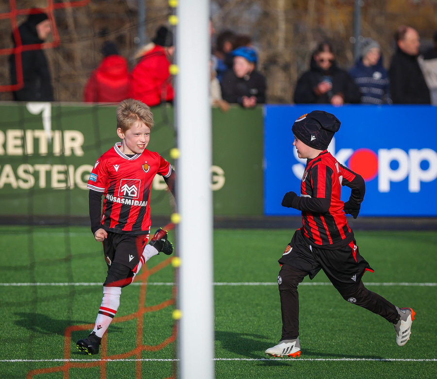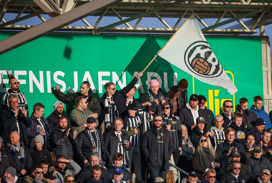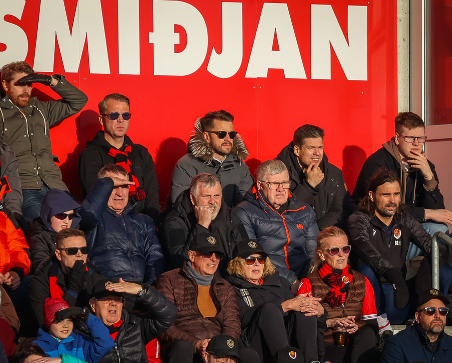 Þá fer leikurinn alveg að bresta á, leikmenn og dómarar labba inn á völlinn. Það er vel mætt í stúkuna enda dýrindis veður og von á góðum knattspyrnuleik.