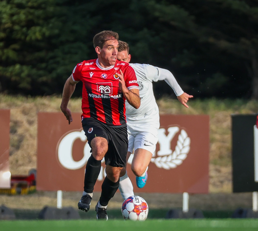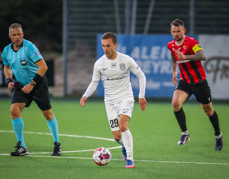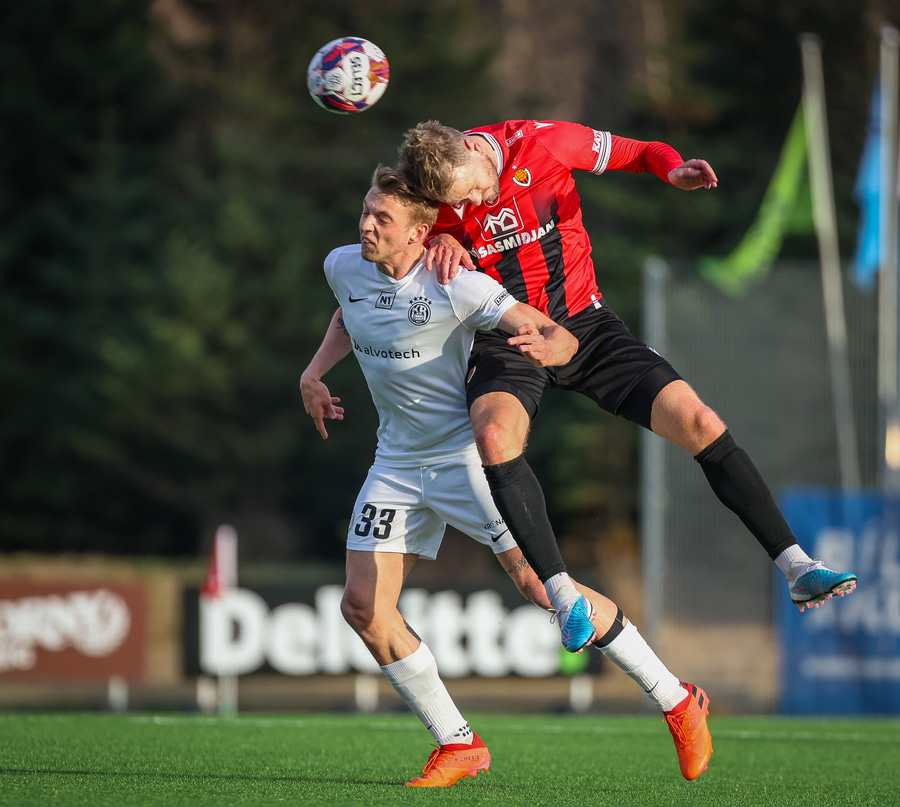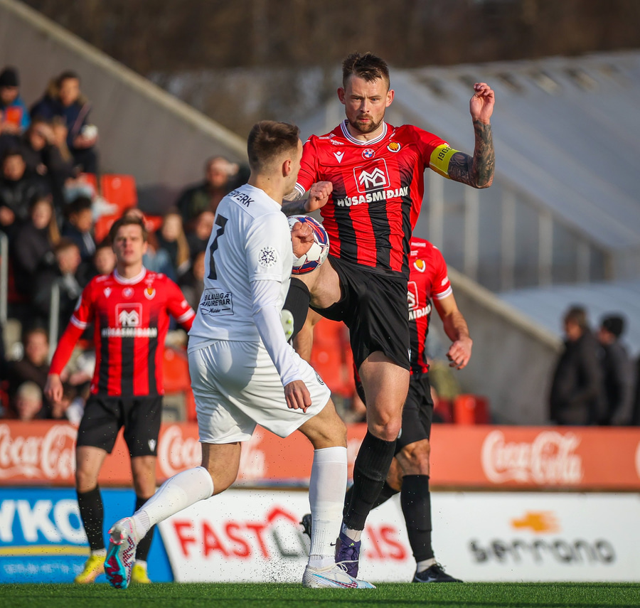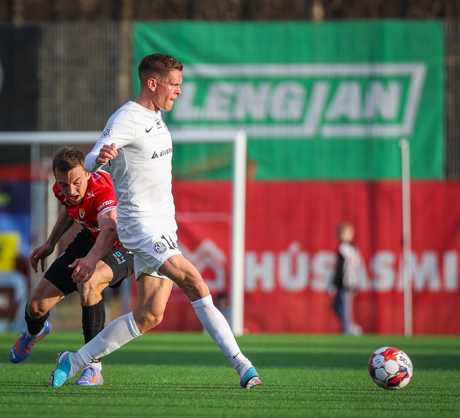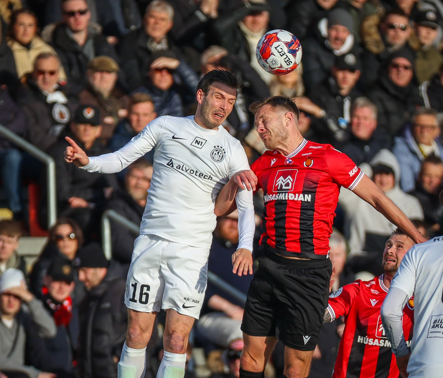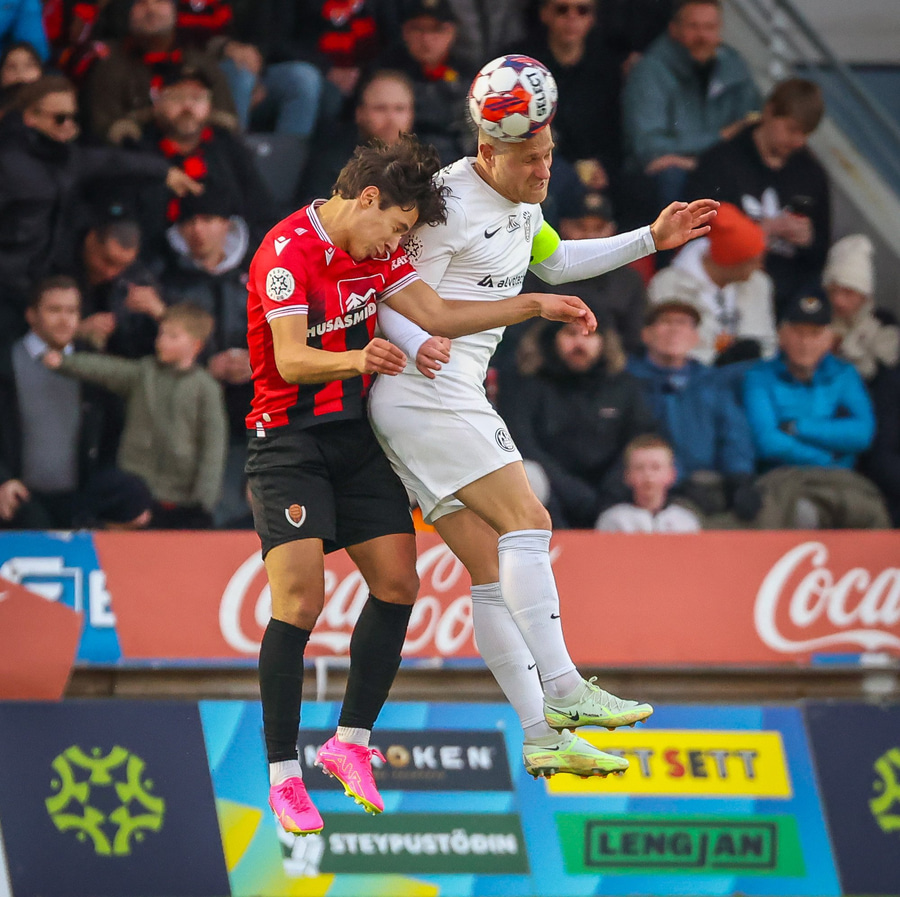 Pablo tekur spyrnuna í átt að Matta Vill en skallinn beint á Kjellevold.