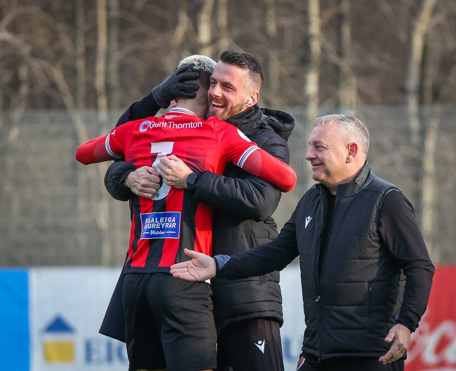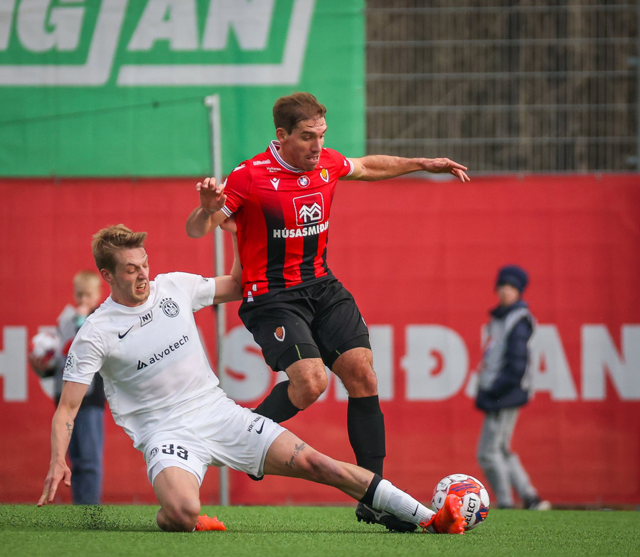 Karl Friðleifur kemur hratt upp hægri kantinn og gefur hann svo á Birni sem leikur listir sínar og kemst framhjá sínum varnarmanni. Hann tekur síðan skotið en það fer af varnarmanni og í horn.