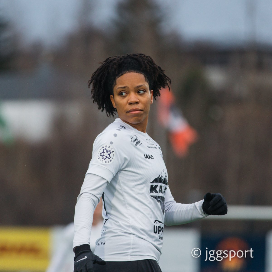 Sunneva hleypur upp kantinn og setur boltan inn í teig þar sem Guðrún er dauðafrí en hún setur boltan framhjá úr upplögðu færi.