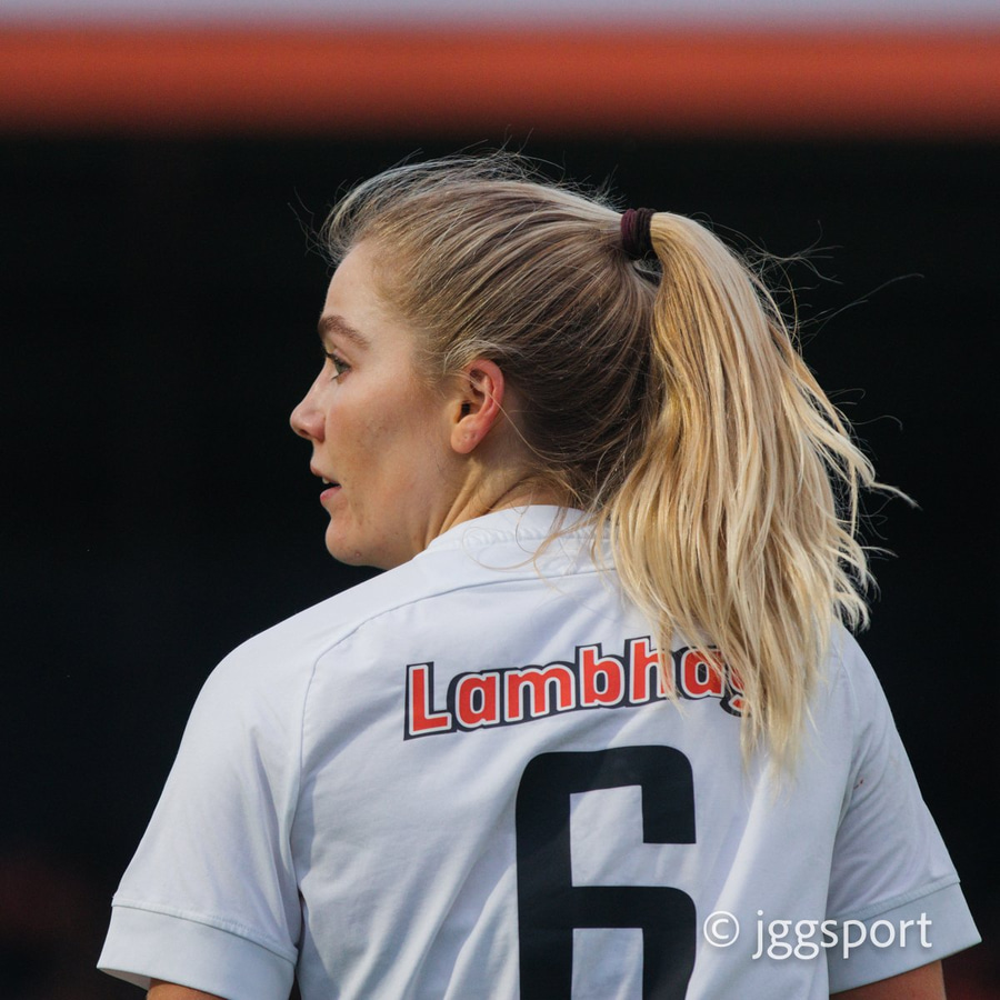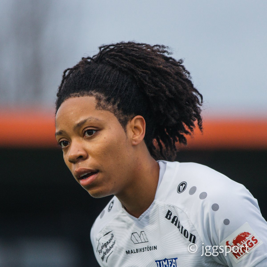 Mist setur frábæran skalla inn í teig sem finnur hausinn á Helgu Guðrúnu sem en skallinn hennar er varinn.