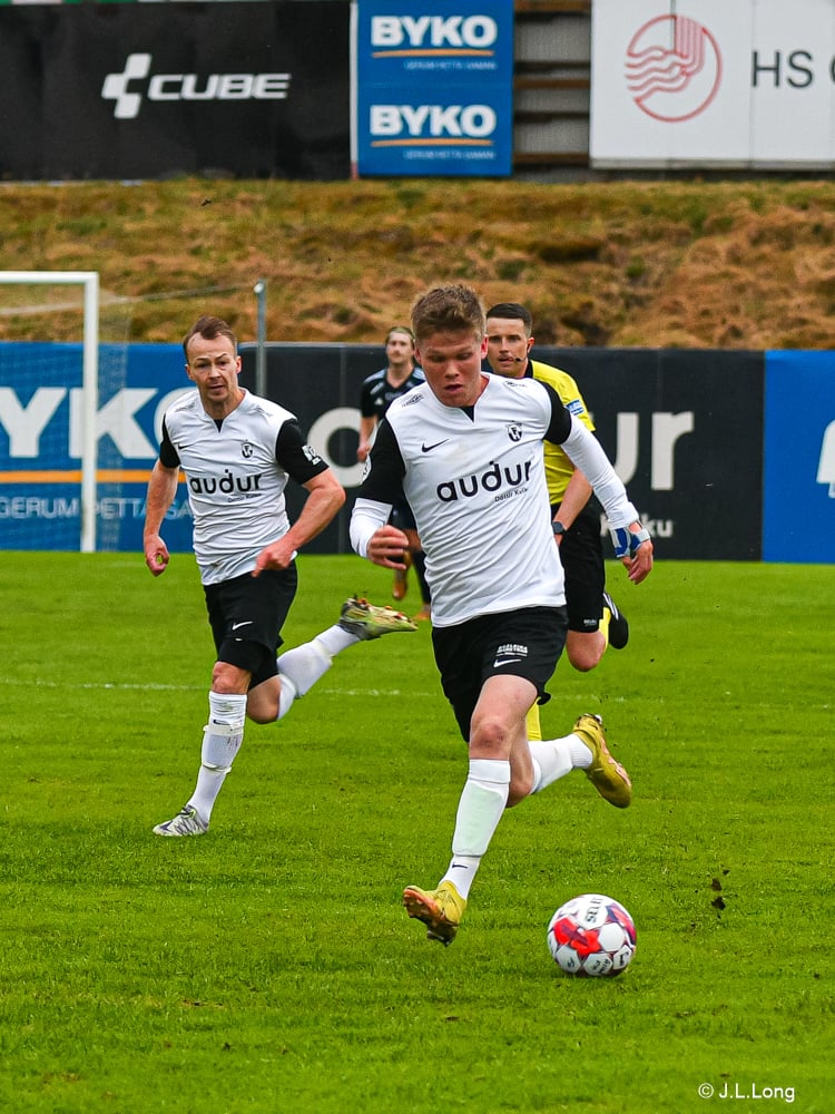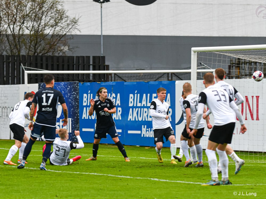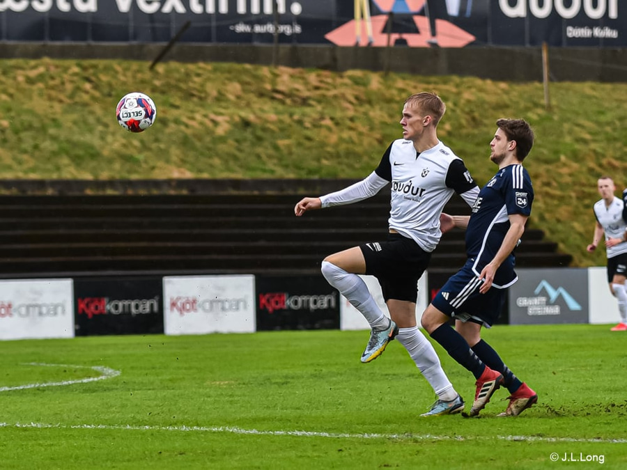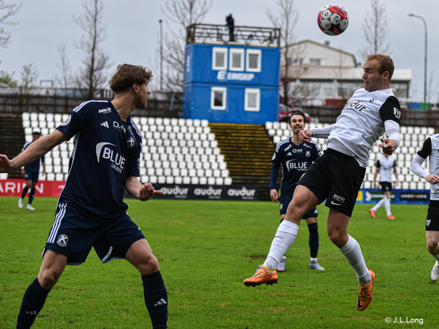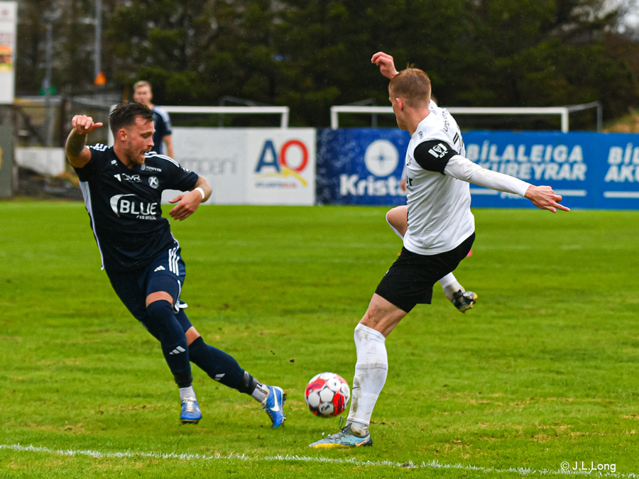 Logi Hrafn vinnur boltan af Keflvíkingum og brunar af stað og mundar skotfótinn. Skotið hans fer af varnarmanni og ratar til Kjartans sem á svo líka skoti í varnarmann.