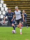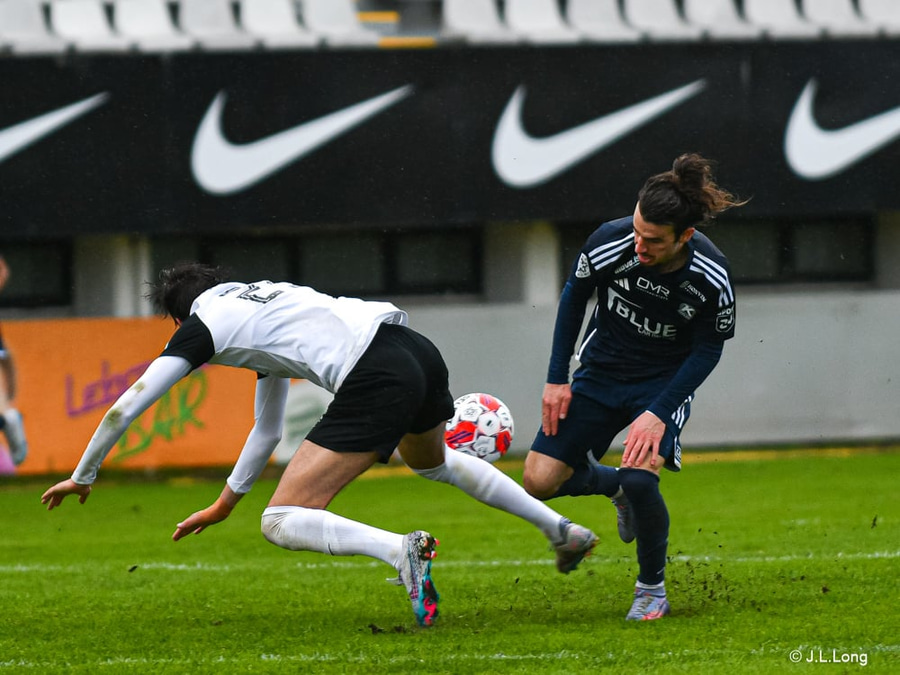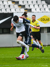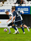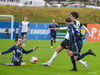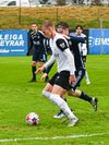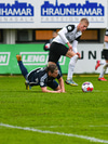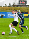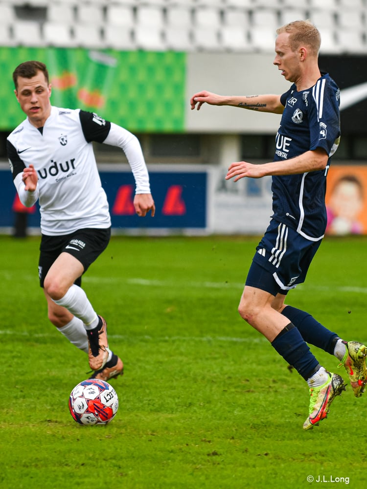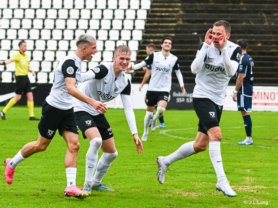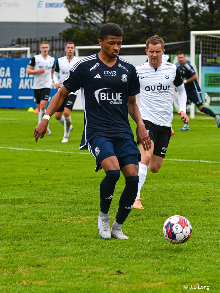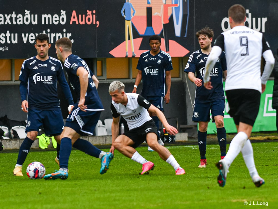 Logi Hrafn vinnur boltan af Keflvíkingum og brunar af stað og mundar skotfótinn. Skotið hans fer af varnarmanni og ratar til Kjartans sem á svo líka skoti í varnarmann.