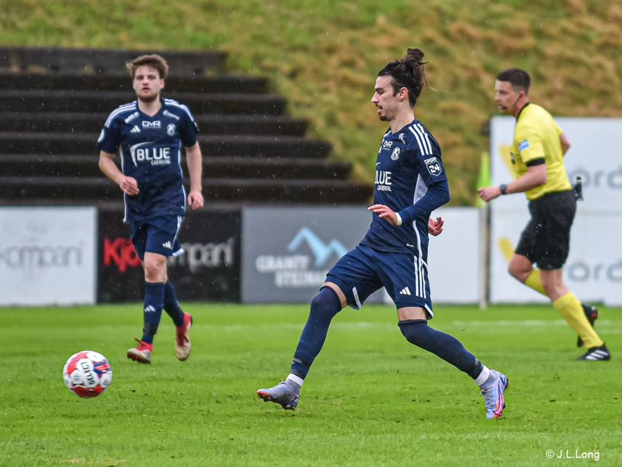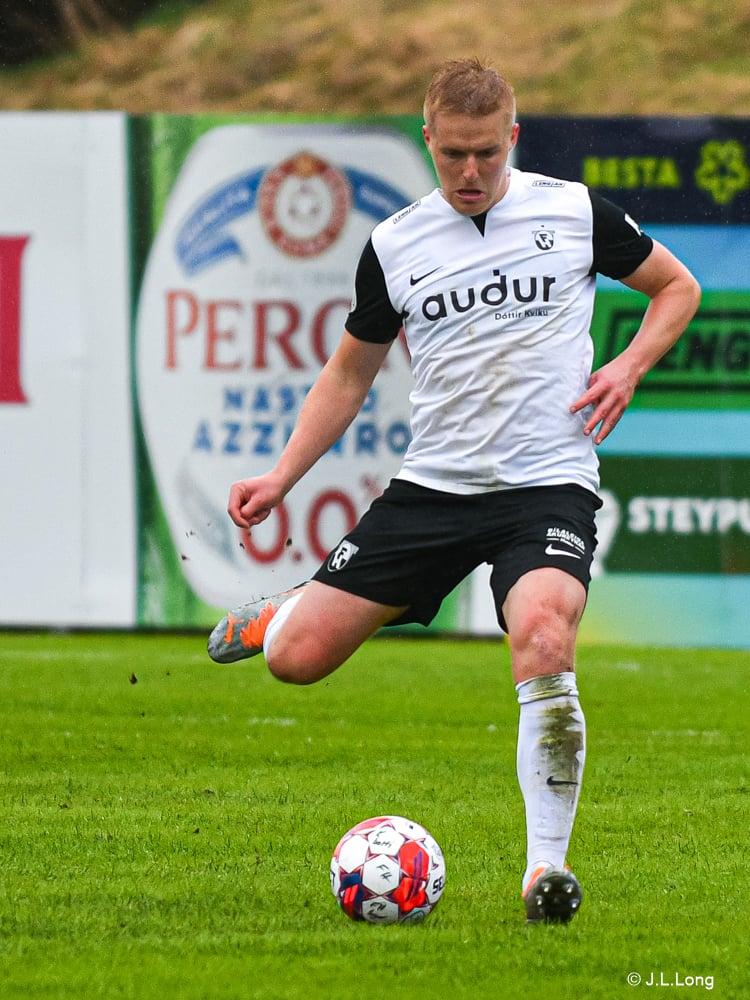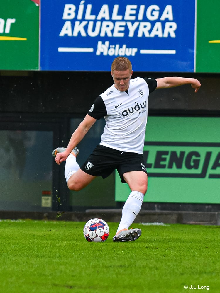 Edon Osmani ætlar að senda boltan til baka á markmann frá miðlínu en hittir engan vegin boltan þannig að þessi sending breytist í frábæra stungusendingu á Kjartan!