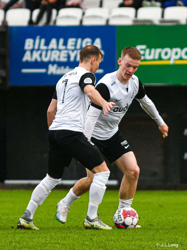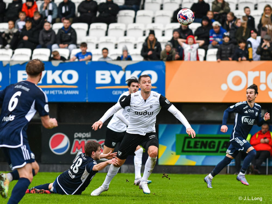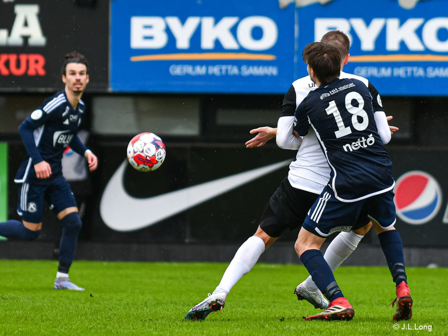 Kjartan Kári prjónar sig upp hægri kantinn og á svo skot sem fer í varnarmann. Heimamenn eru alveg brjálaðir og vilja fá hendi víti en Vilhjálmur gefur til kynna að hann hafi verið með hendina við síðuna og því ekki brotlegt.