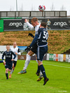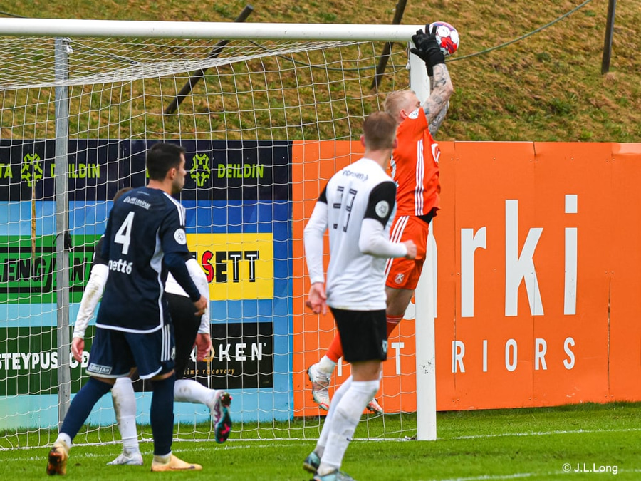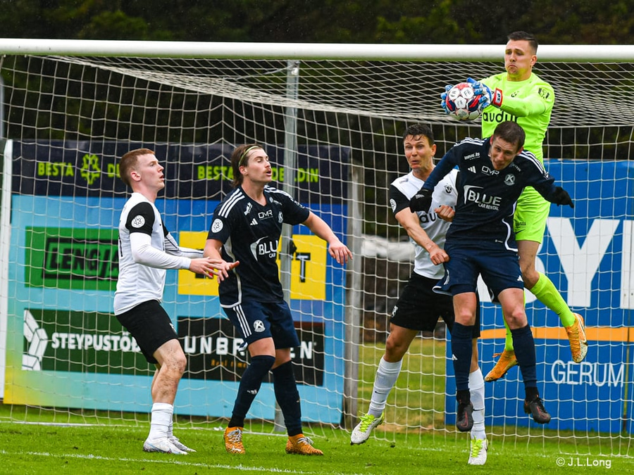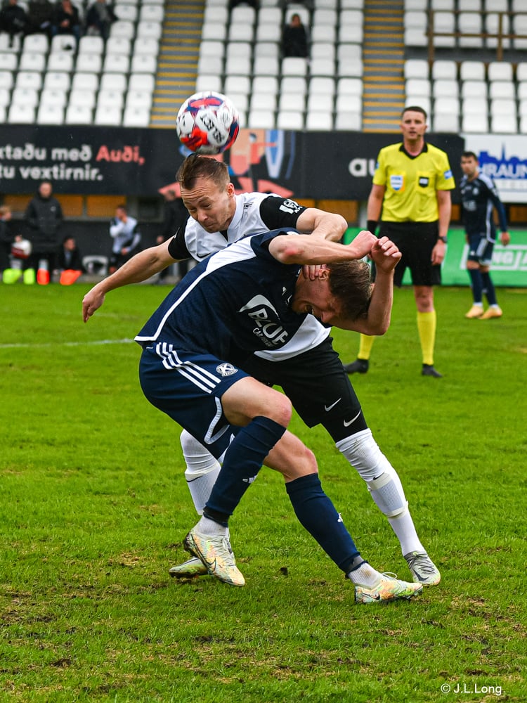 Blair gerir hinsvegar mjög vel og nær einhvervegin að setja boltan fyrir markið þannig að boltinn gæti rúllað inn en Eggert bjargar á línu