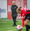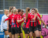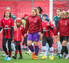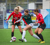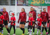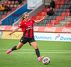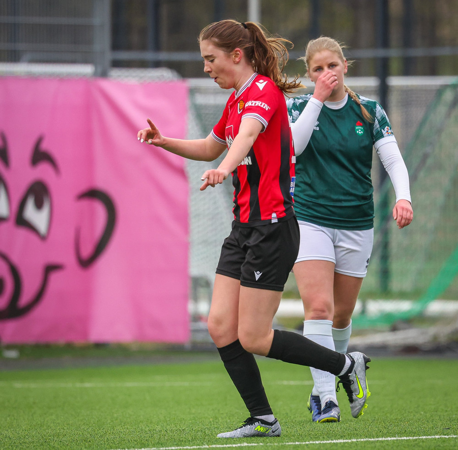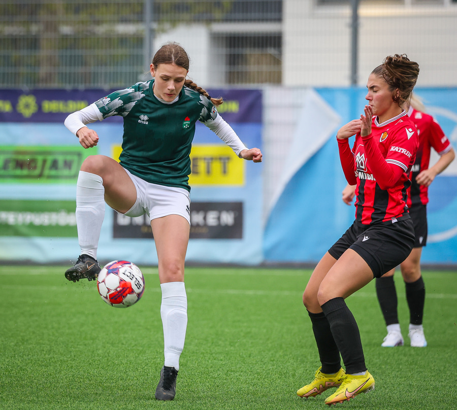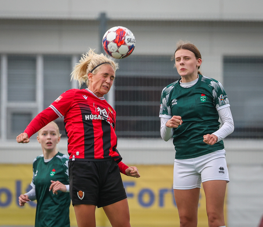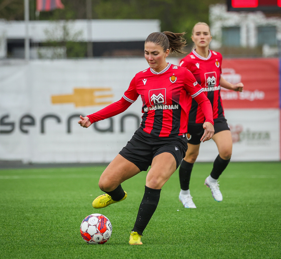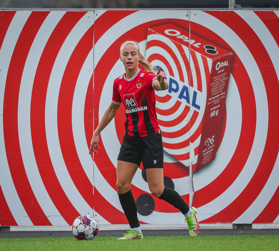 Herdís fær boltann í markinu og er lengi að losa sig við hann, Nadía vinnur boltann af henni en setur boltann framhjá. Herdís stálheppin!